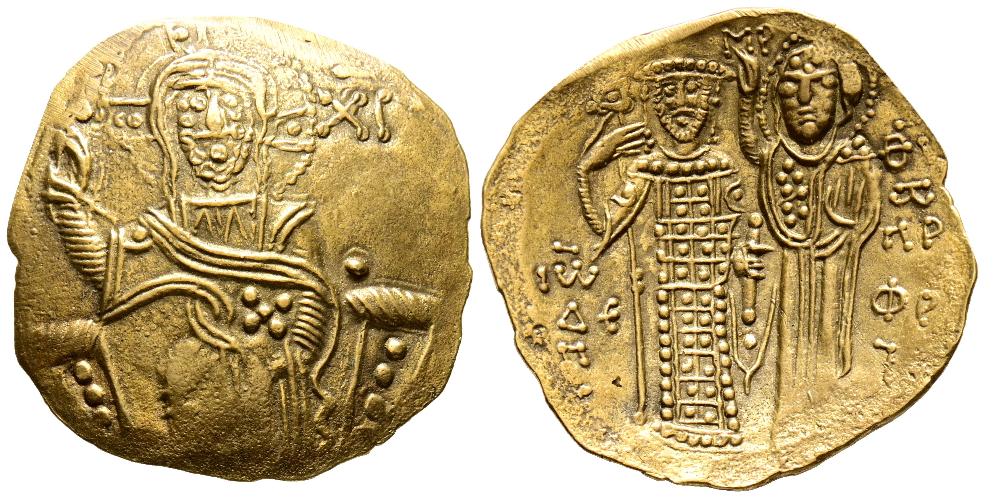 JUAN III. Hyperpyron. (El. 2,26g/24mm). 1232-1254 d.C. Magnesia. (Seaby 2073). Anv: Cristo sentado de frente en trono alzando mano izquierda. Rev: Juan III Y Maria estante a izquierda, alrededor monogramas. MBC.