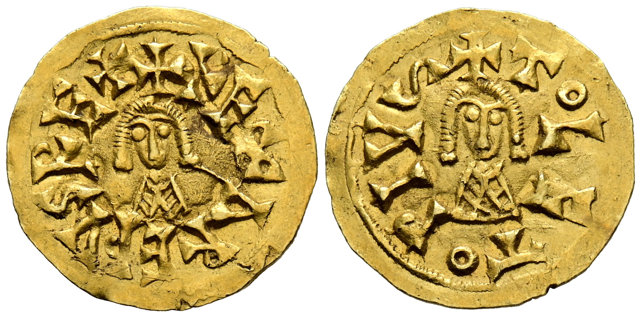RECAREDO I. (586-601). Tremissi. (Au. 1,49g/17mm). Toledo. (R. Pliego 98b; CNV 73.2). Anv: Busto de frente, alrededor leyenda: RECCAREDVS REX. Rev: Busto de frente, alrededor leyenda: TOLETO PIVS. MBC+. Escaso ejemplar.