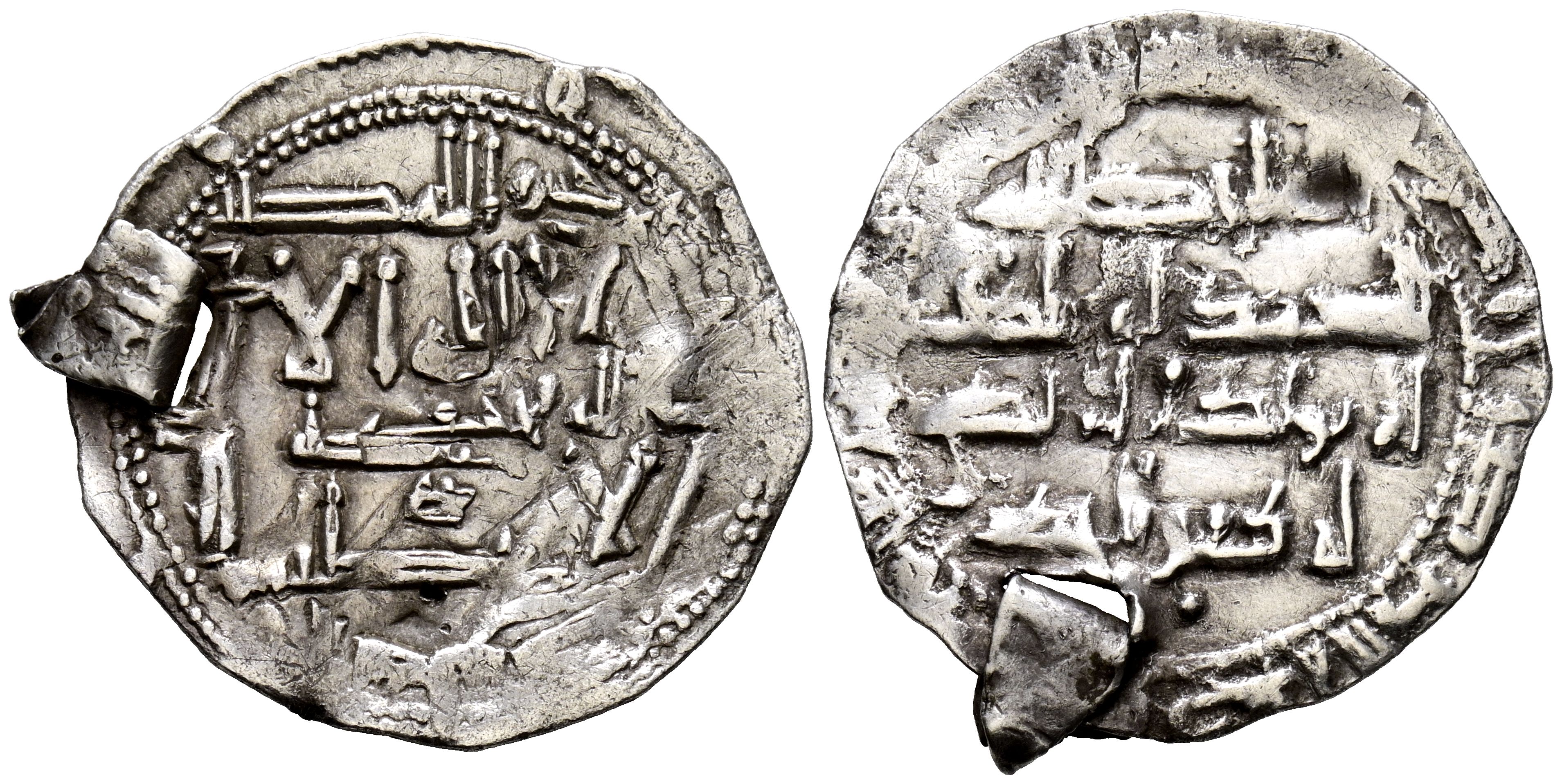 EMIRATO INDEPENDIENTE DE CÓRDOBA. Dirham. (Ar. 2,69g/25mm). Fecha a examinar. al-Ándalus. Posiblemente, anterior a la mejora de diseño del 229H. (Perforación con remache). BC+ Interesante para estudio.