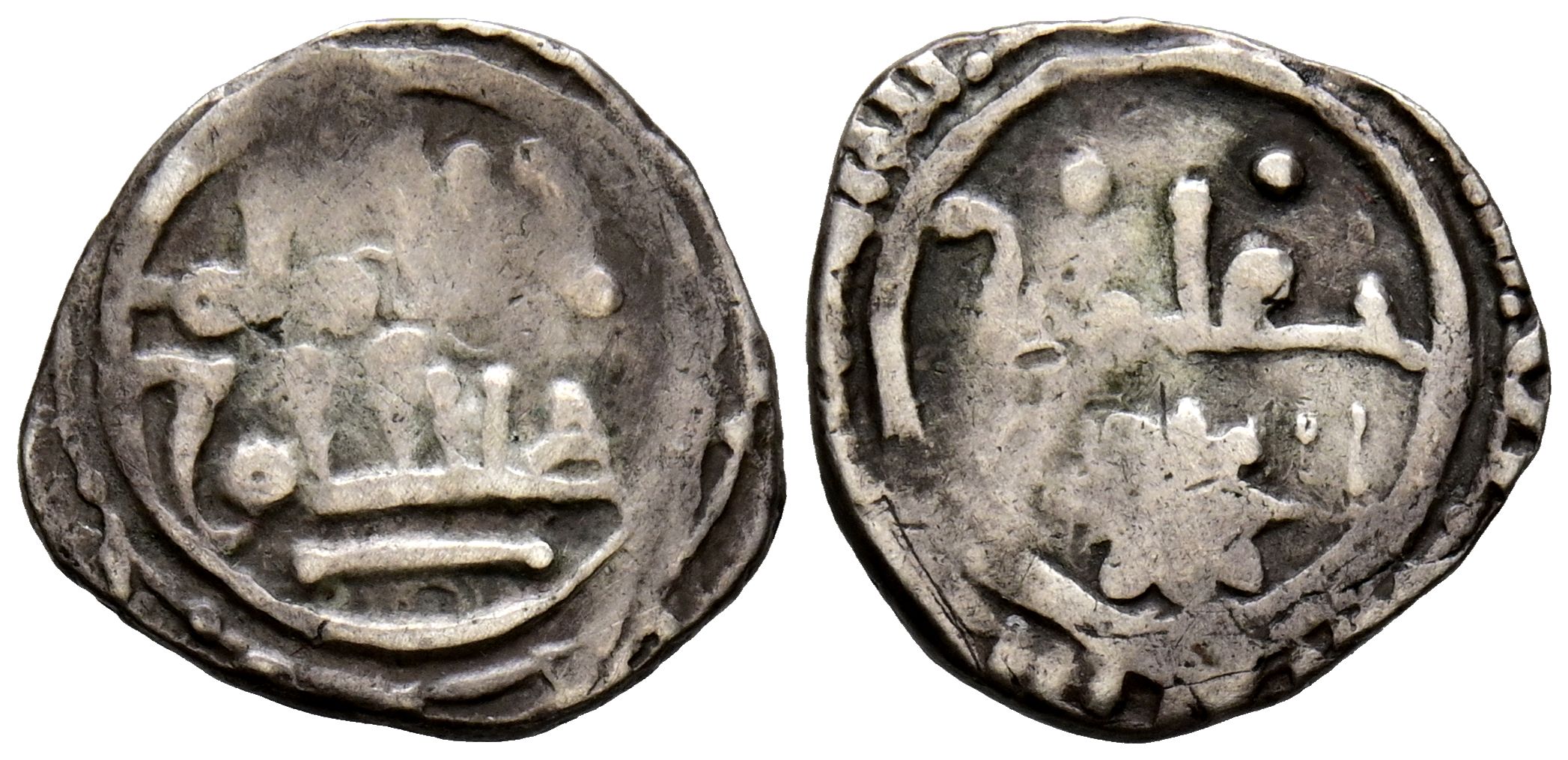 CALIFATO DE CÓRDOBA, Acuñación Norte-Africana. Hisam II (2º Reinado). 1/2 Dirham. (Ar. 1,23g/14mm). Sin fecha ni ceca. Anv: الامار / هشام (El Iman / Hisam). Rev: عامر (´Amir). (Gaspariño 2016, Tipo 3; Manquso Nº2, pág 27, mismo ejemplar). MBC. Muy escasa.