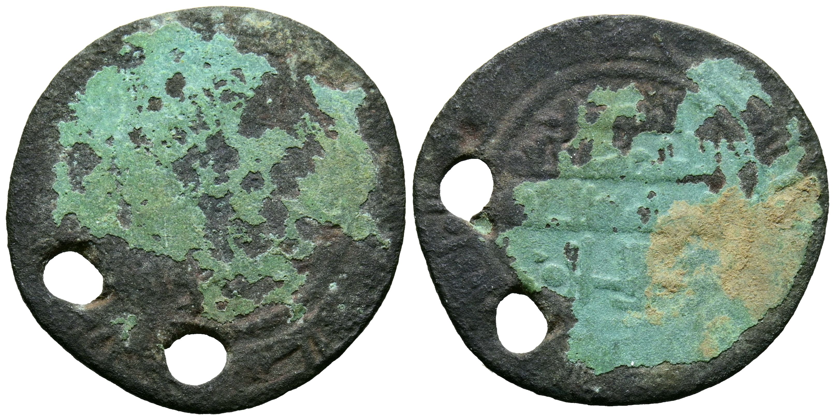 REINOS DE TAIFAS. TAIFA DE BADAJOZ, Umar al-Mutawakkil B. Muhammad B. 'Abd Allah (460-487h/1067-1094). Dírham. (Ve. 2,15g/22mm). Sin fecha. Badajoz. (Vives 1006). MC/RC. Raro ejemplar. Dos perforaciones.