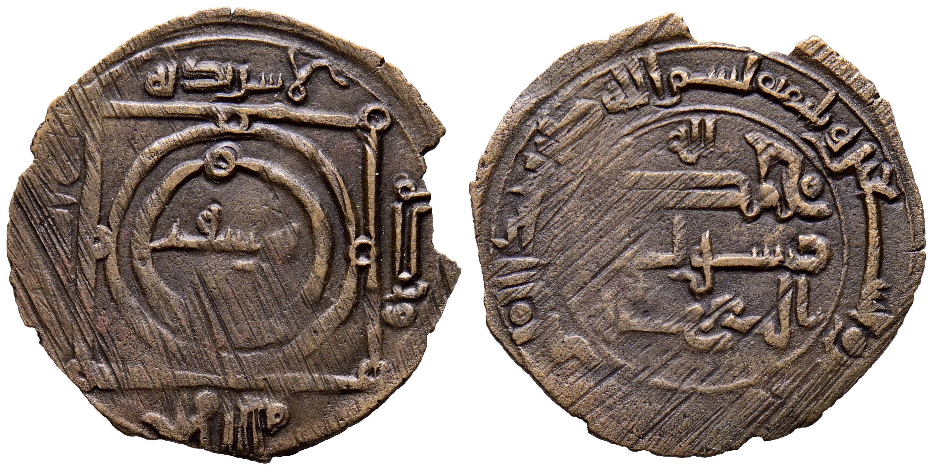 QARAJANÍES. GRANDES JANES. YUSUF B. 'ABD ALLAH MENCIONANDO A AHMAD B. 'ALI KHAN (403-405/1012-1014). Felús. (Ae 1,36g/22 mm). 395 H. Al-Sas. (Kochnev-159). MBC. Rotura al borde y rayas de acuñación.