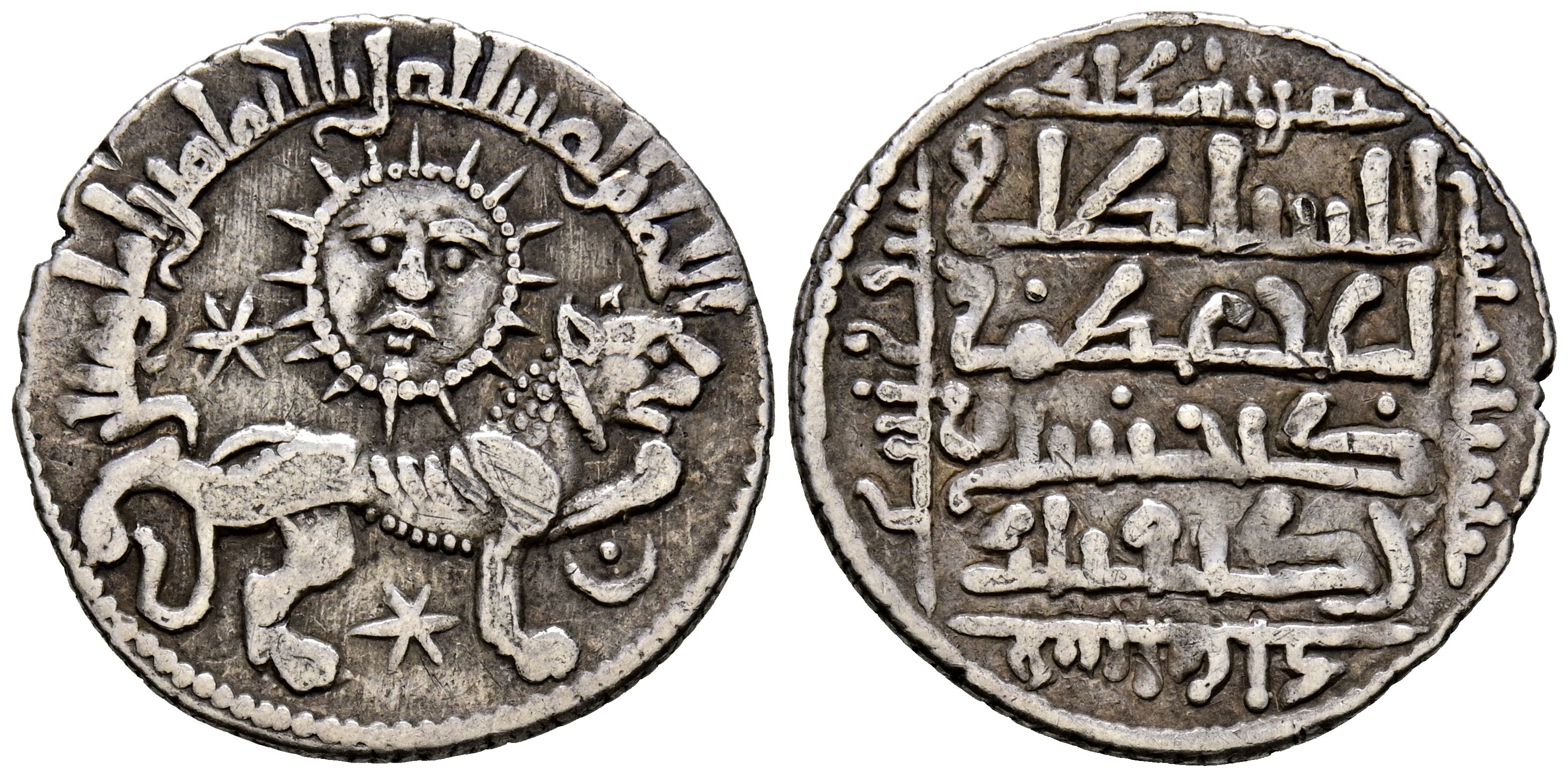SELYUQUÍES DE RUM, Ghiyath al-Din Kay Khusraw II bin Kay Qubadh (634-644H/1237-1246). Dirham. (Ar. 2,90g/22mm). 639H. Konya. Anv: León avanzando hacia la derecha entre dos estrella, luna y creciente entre las patas y personificación del sol arriba, alrededor leyenda en forma de arco. Rev: Leyenda. (Broome 272 D(i)a). MBC+. Escaso.