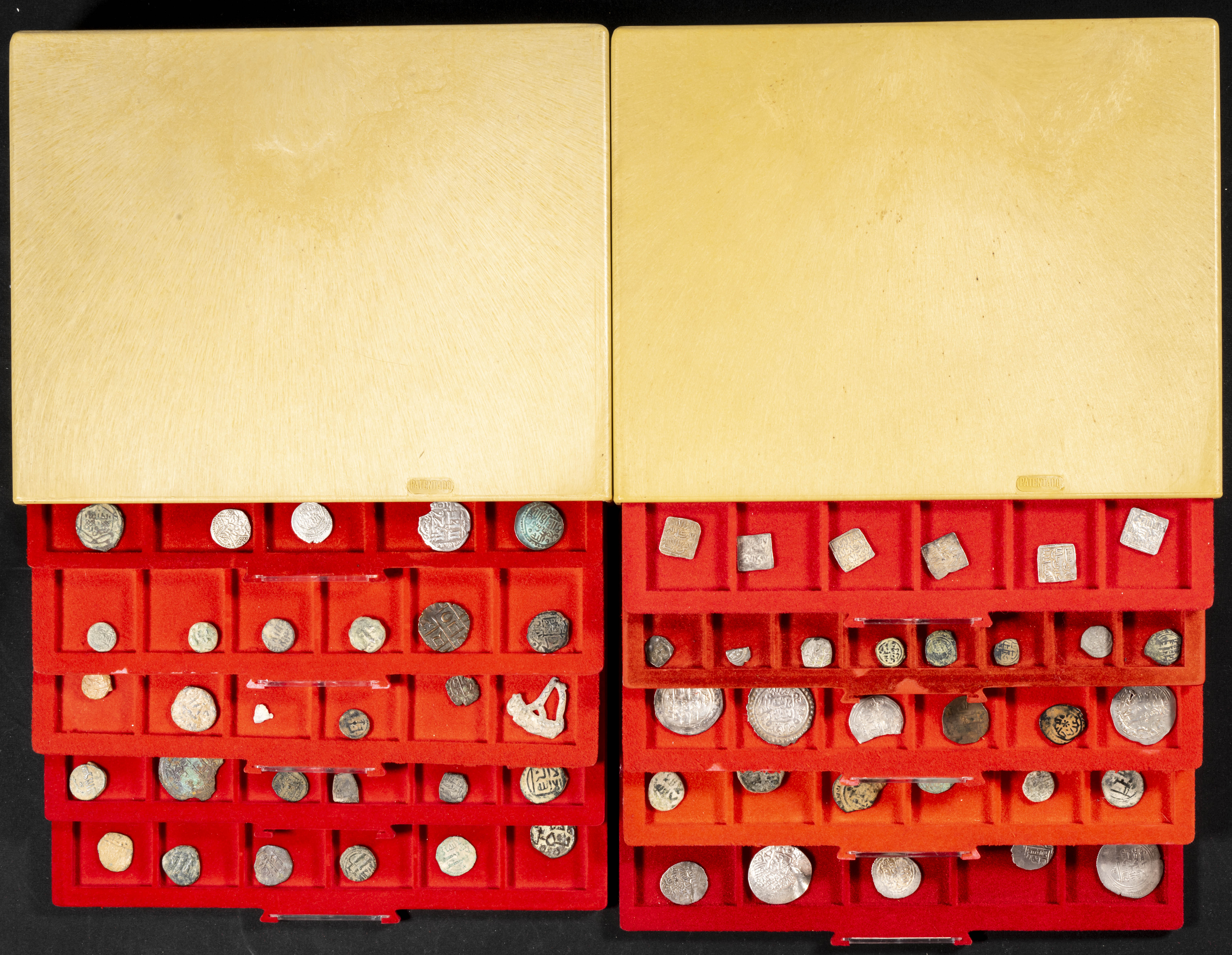 HISPANO-ÁRABE. Magnífico resto de la colección Gaspariño formado por alrededor de 200 monedas de diferentes módulos (dirhams, féluses y fracciones principalmente) así como periodos tanto del ámbito hispano-árabe como del mundo árabe en general. Diferentes estados de conserrvación. A EXAMINAR.