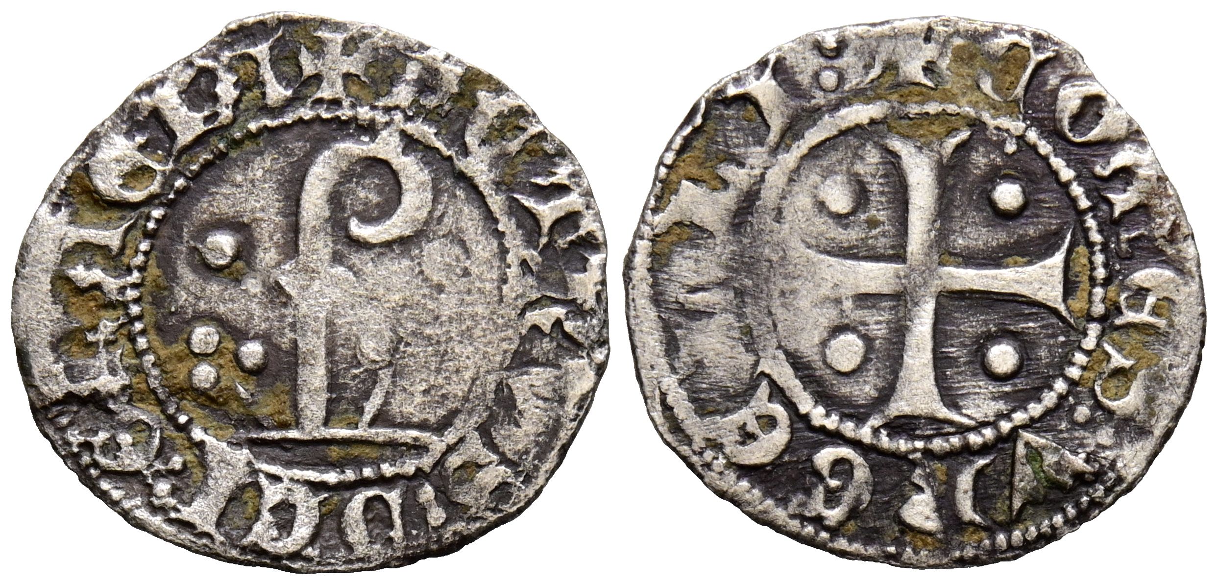 PEDRO DE URGELL (1347-1408). Diner (Ve. 0,65g/17mm). Agramunt (Condado de Urgell). (Cru V.S. 134). Anv: Báculo entre puntos y tréboles, alrededor leyenda: PETRVS DEI GRACI. Rev: Cruz interior patada con puntos en los espacios, alrededor leyenda: COMES VRGELLI. MBC.