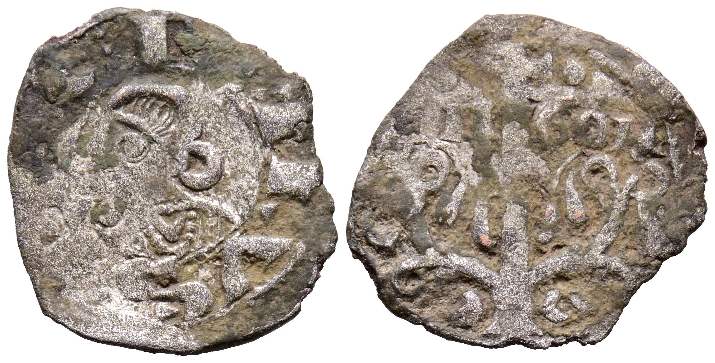 PEDRO EL DE HUESCA (1094-1104). Dinero. (Ve. 0,63g/17mm). Jaca. (Cru V.S. 213). Anv: Busto con el pelo recogido a izquierda, alrededor leyenda: PETRVS REX. Rev: Arbol, encima cruz, entre: ARA-GON. BC+.