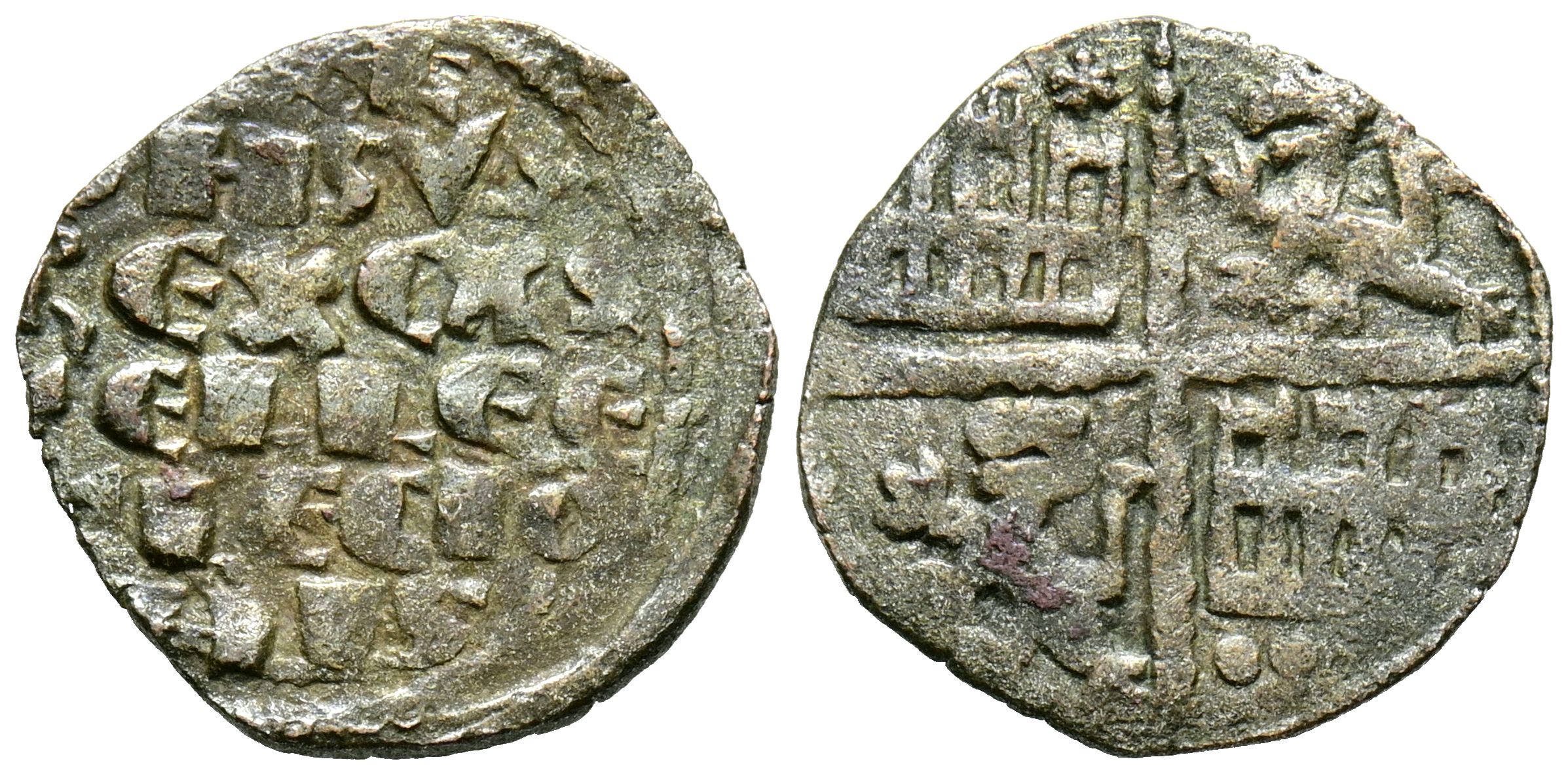 ALFONSO X (1252-1284). Dinero. (Ve. 0,97g/17mm). Marca de ceca: Estrella. (FAB-234.1-var). Anv: Leyenda en seis líneas: ALFONSVS REX CASTELLE ET LEGIONIS. Rev: Castillos y leones con marca de ceca en 1º cuadrante y dos puntos en el 3º. MBC-