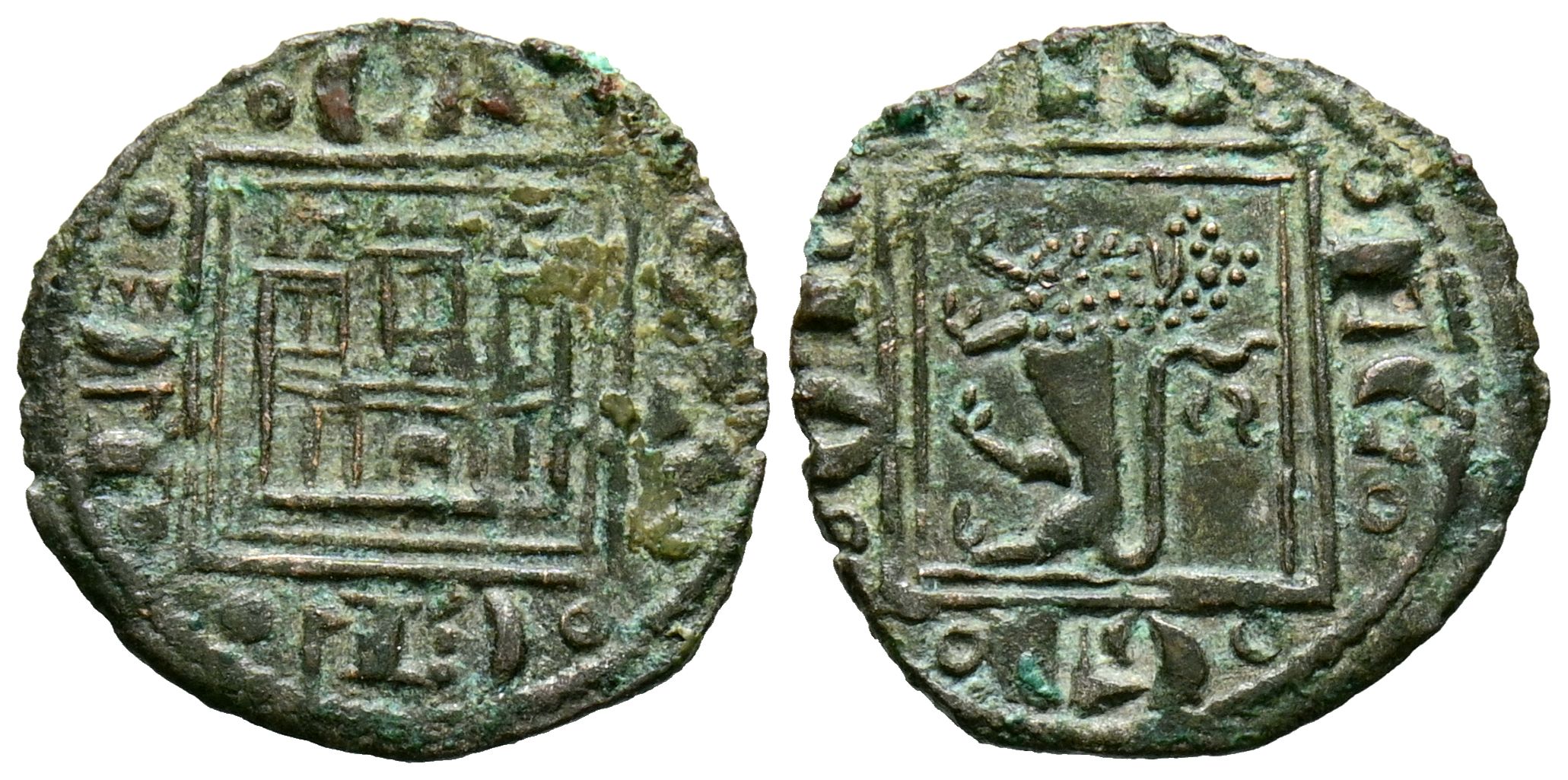 ALFONSO X (1252-1284). Obolo (Ve. 0,49g/15mm). Marca de ceca creciente. (FAB-288). Anv: Castillo, encima creciente, todo dentro de gráfila cuadrada, alrededor leyenda: LEGIONIS. Rev: León estante a izquierda dentro de gráfila cuadrada, alrededor leyenda: CASTELLE. MBC+.