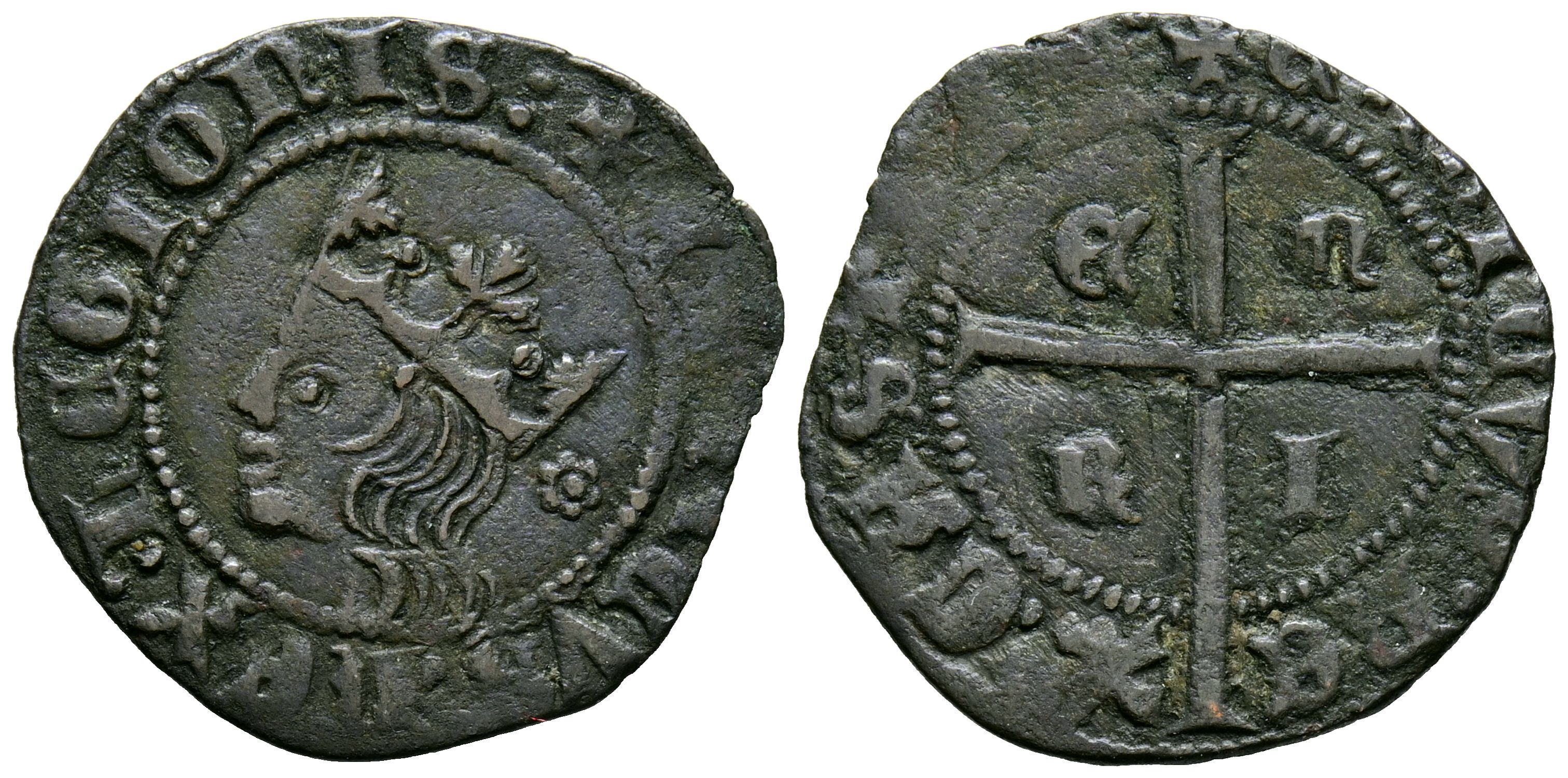 ENRIQUE II (1368-1379). Cruzado (Ve. 1,60g/21mm). Florón como marca de ceca. (FAB-458). Anv: Cabeza coronada a izquierda, detrás marca de ceca, todo dentro de gráfila circular y alrededor leyenda: ENRICVS REX LEGIONIS. Rev: Cruz latina rompiendo gráfila, en los cuarteles E-N-R-I y alrededor leyenda: ENRICVS REX CASTELLE. MBC.