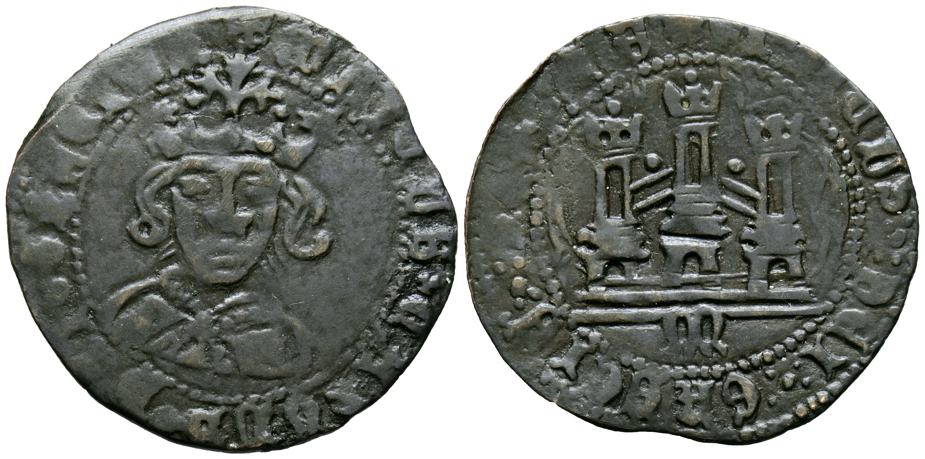 ENRIQUE IV (1454-1474). Cuartillo (Ae. 2,21g/27mm). Medina del Campo. (FAB-749.1). Anv: Busto coronado del rey de frente, dentro de gráfila circular. En leyenda: ENRICVS CARTVS DEI GRACIA. Rev: Castillo, debajo M gótica, todo dentro de gráfila lobular. En leyenda: ENRICVS DEI GRACIA REX C. MBC. Rara.