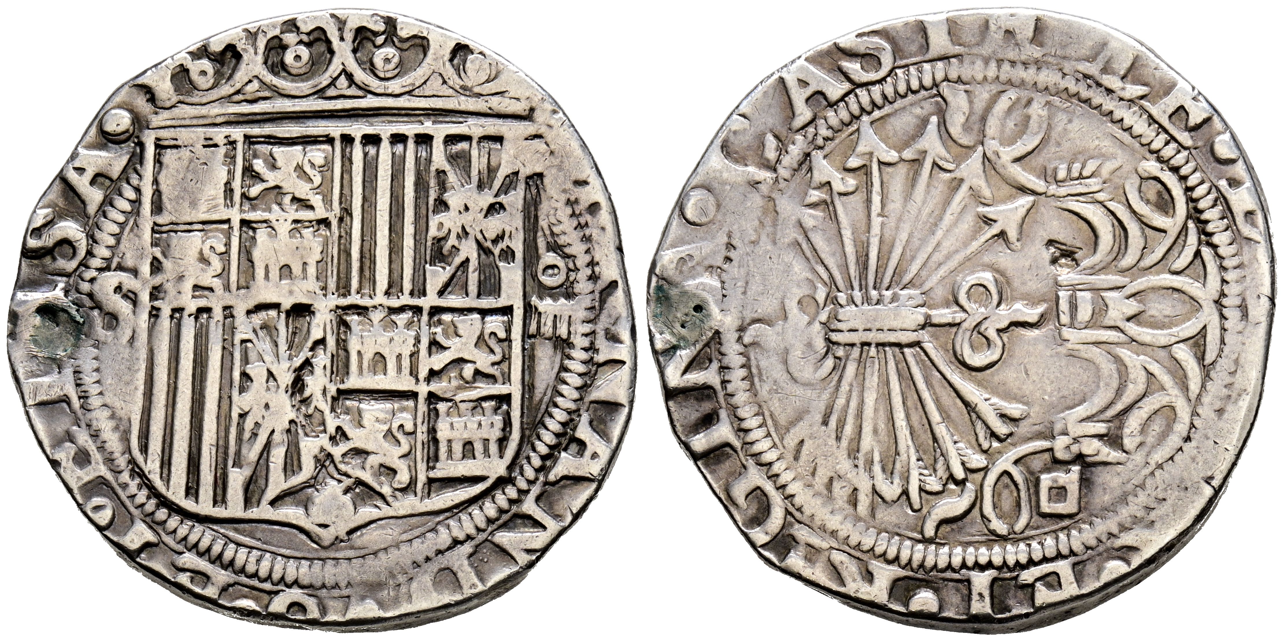 REYES CATÓLICOS (1474-1504). 4 Reales. (Ar. 13,30g/31mm). S/D. Sevilla. (Cal-2019-564). Ensayador en reverso. MBC. Limpiada. Perforación reparada a las 9h.