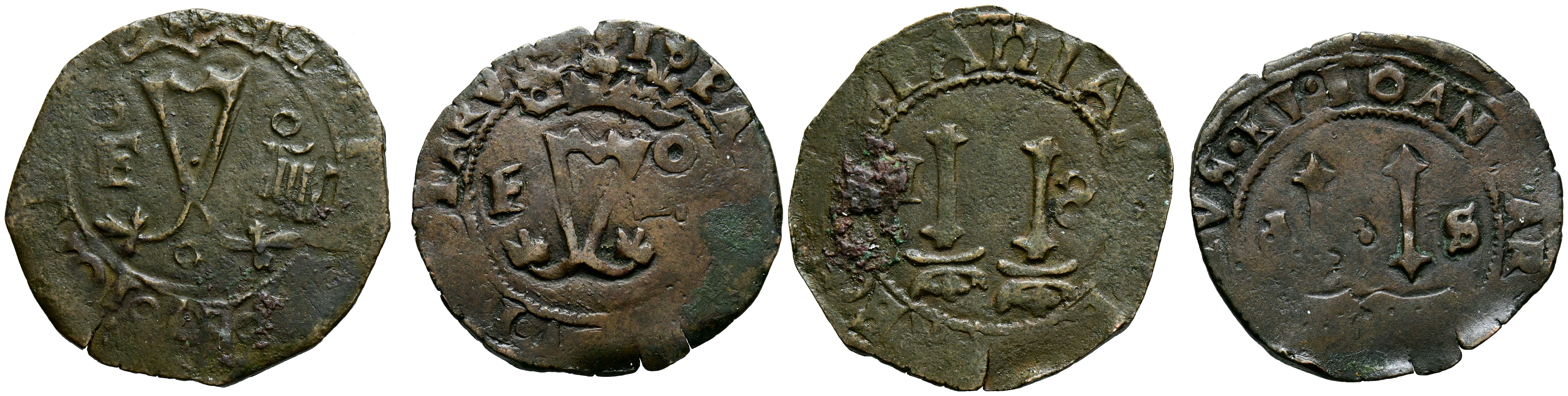JUANA Y CARLOS (1504-1555). Pareja de 4 Maravedís acuñados en Santo Domingo F- SP. (Cal-2019-35). Diferentes estados de conservación. A EXAMINAR.