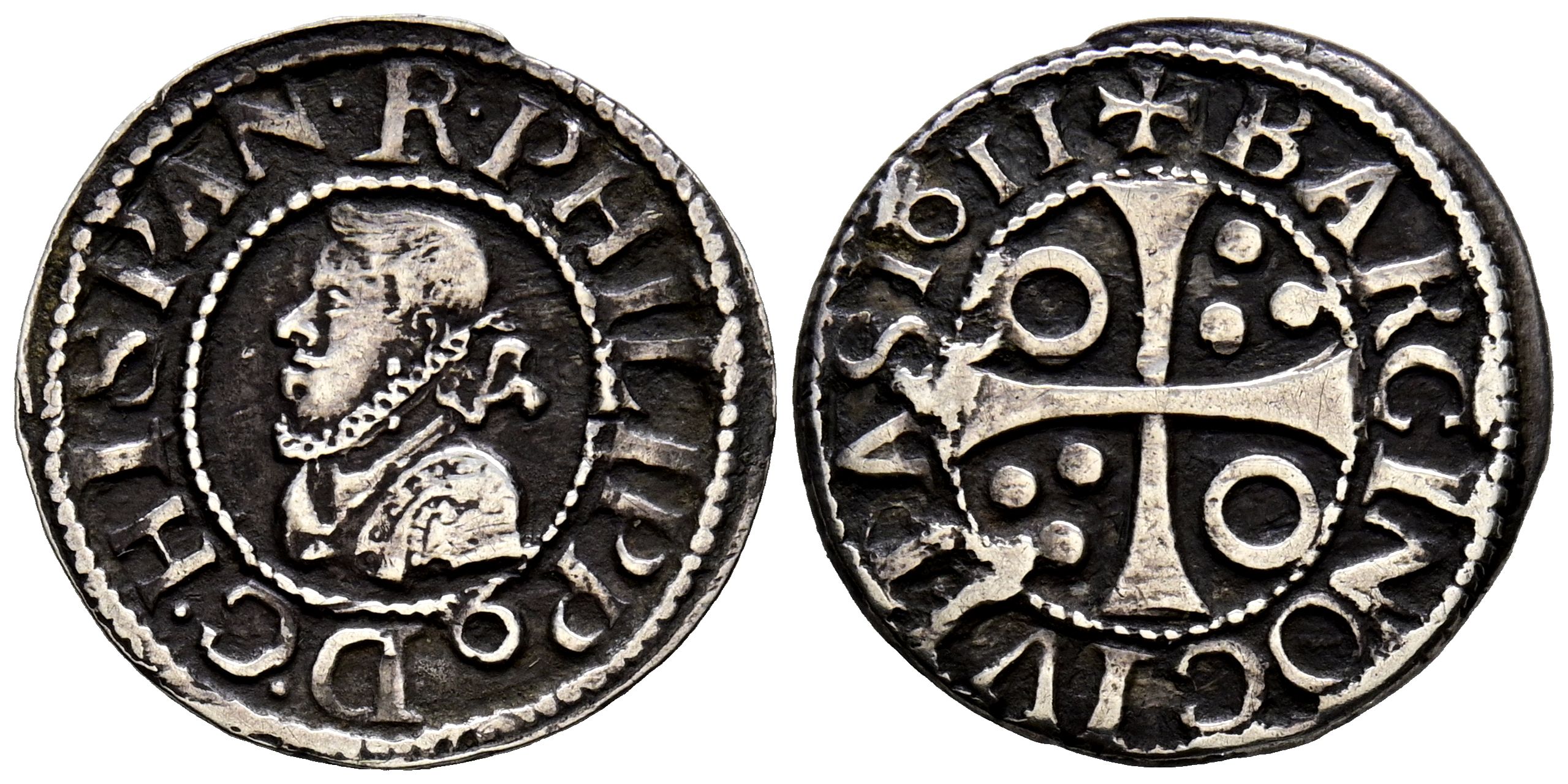 FELIPE III (1598-1621). 1/2 Croat. (Ar. 1,55g/18mm). 1611. Barcelona. (Cal-2019-374). Cruz no corta la leyenda. MBC.