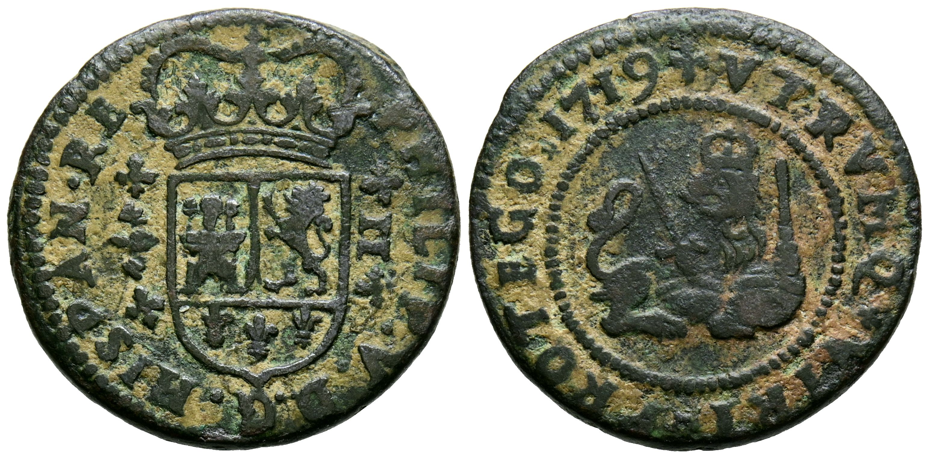 FELIPE V (1700-1746). 2 Maravedís (Ae. 4.43g / 22mm). 1719. Valencia. (Cal-2019-78). MBC-.