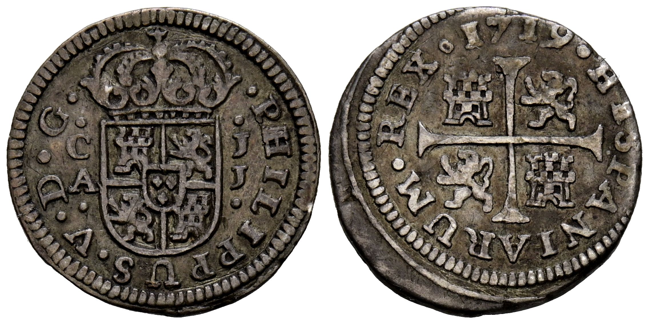 FELIPE V (1700-1746). 1/2 Real. (Ar. 1,21g/16mm). 1719. Cuenca JJ. (Cal-2019-105). MBC/MBC-. Pátina.