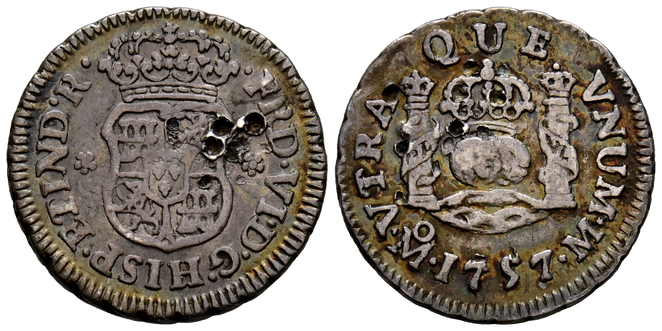 FERNANDO VI (1746-1759). 1/2 Real. (Ar. 1,51g/16mm). 1757. México M. (Cal-2019-93). Dos coronas reales sobre columnas. MBC-. Marcas de punzón. Pátina.