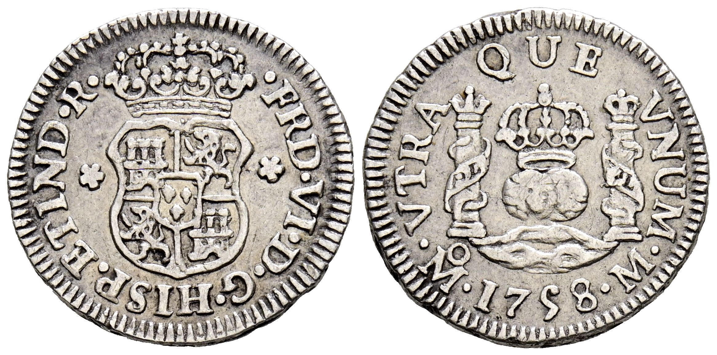 FERNANDO VI (1746-1759). 1/2 Real. (Ar. 1,66g/16mm). 1758. México M. Corona real e imperial sobre columnas. (Cal-2019-97). MBC+. Bonita pátina.