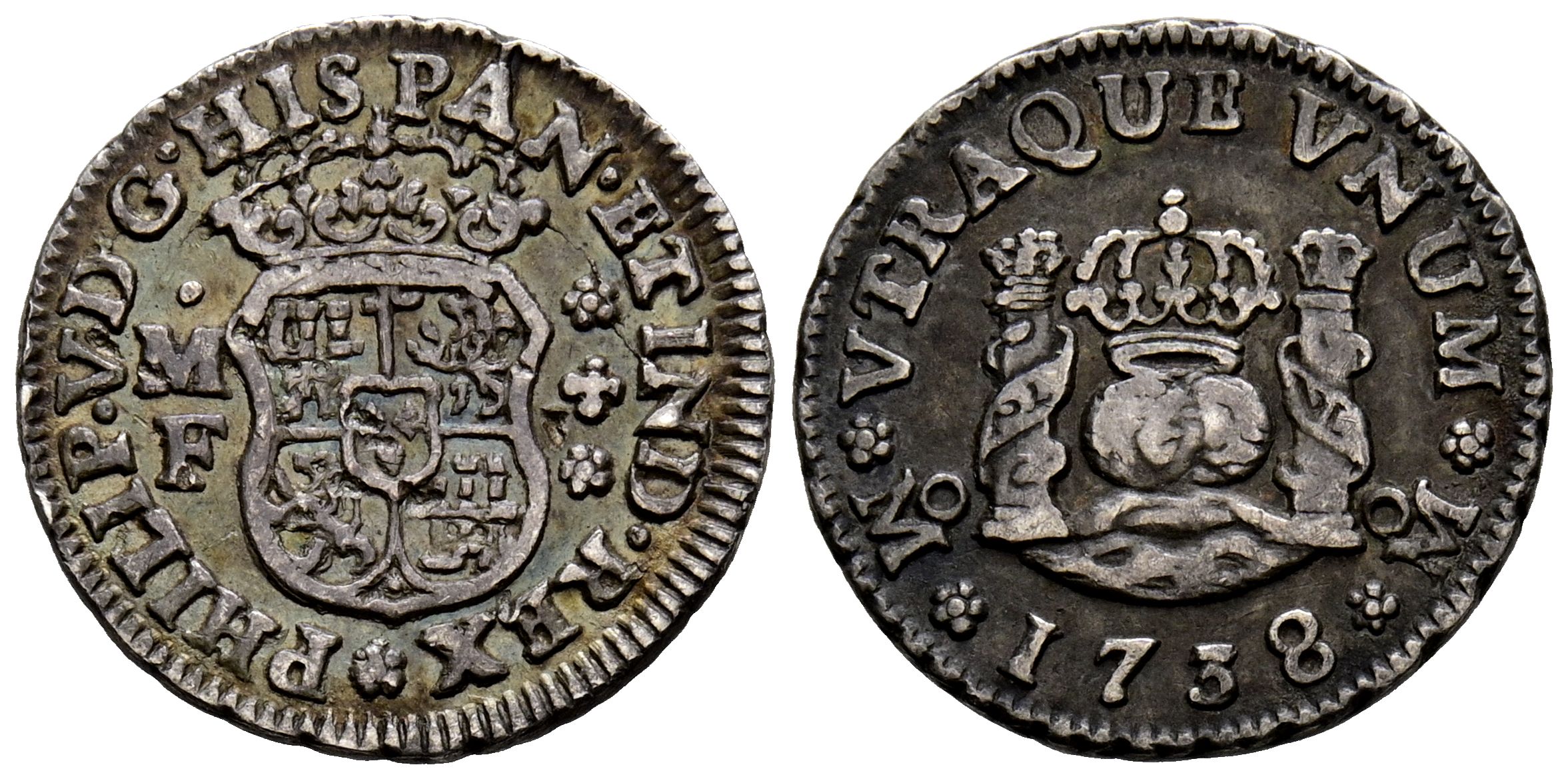 FERNANDO VI (1746-1759). 1/2 Real. (Ae. 1,65g/16mm). 1758. México M. (Cal-2019-97). Corona real e imperial MBC+.