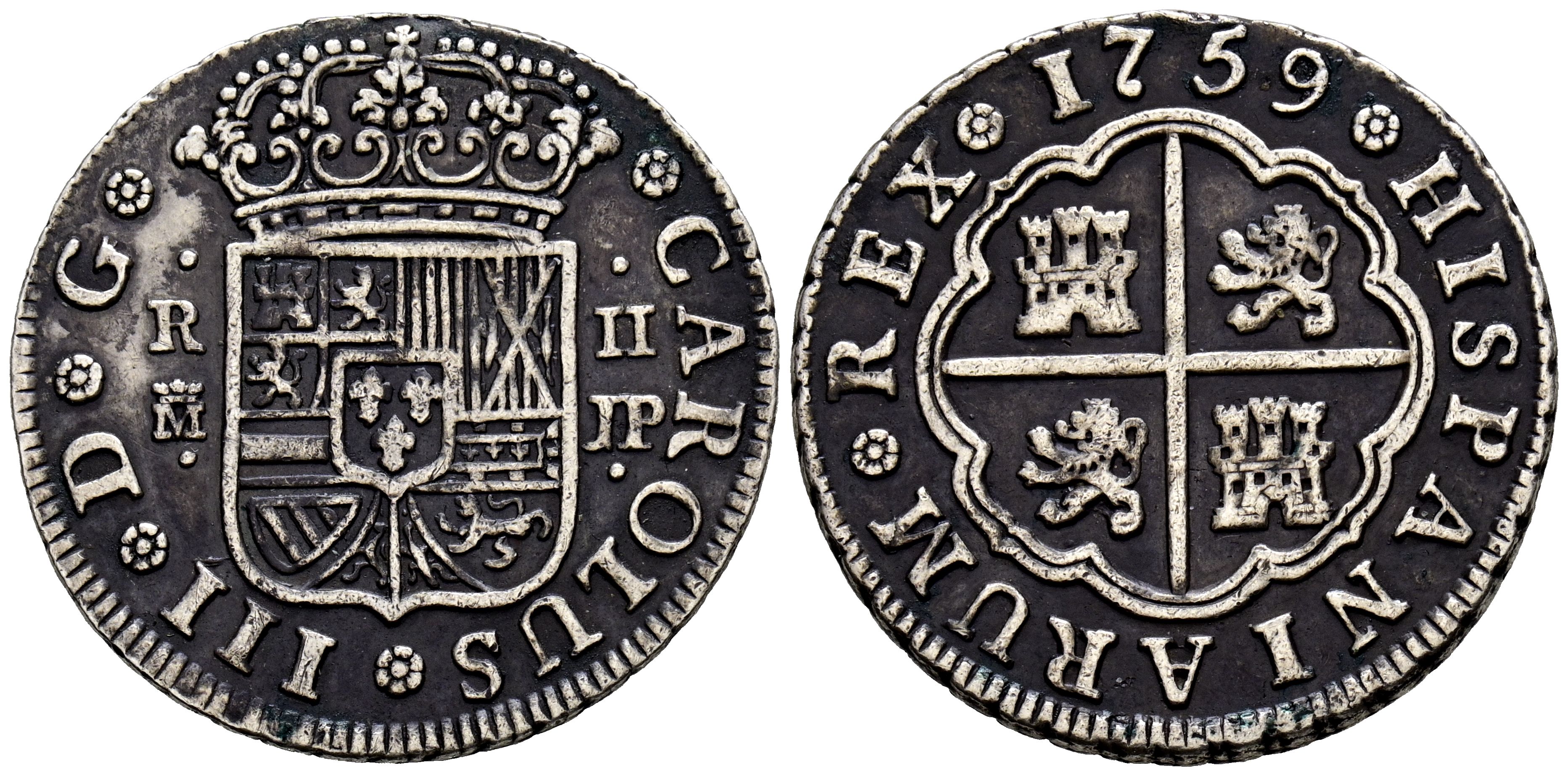 CARLOS III (1759-1788). 2 Reales. (Ar. 5,78/27mm). 1759. Madrid JP. (Cal-2019-607). MBC. Pátina negra.
