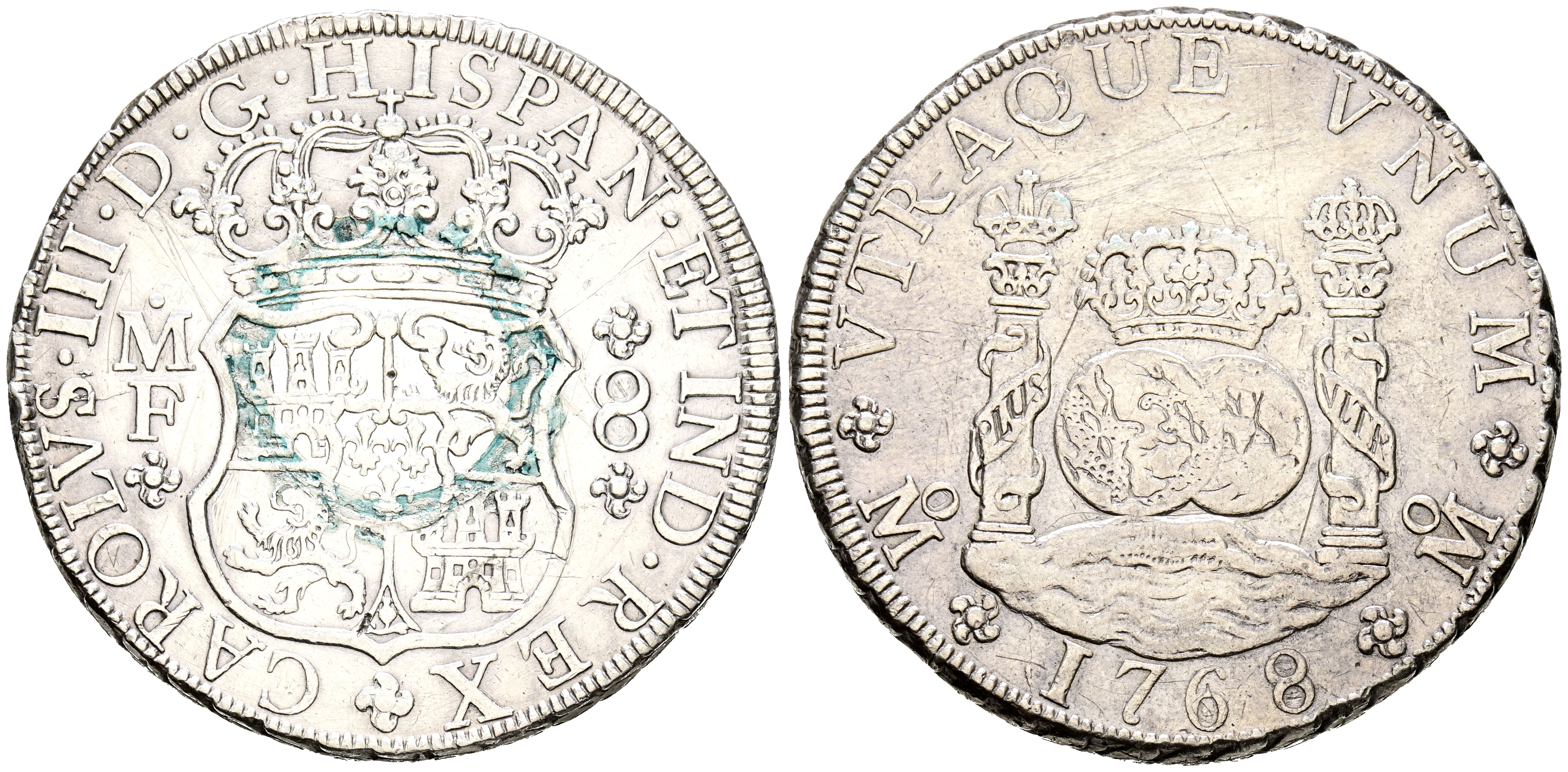 CARLOS III (1759-1788). 8 Reales. (Ar. 26,75g/39mm). 1768. México MF. (Cal-2019-1094). MBC. Limpiado.