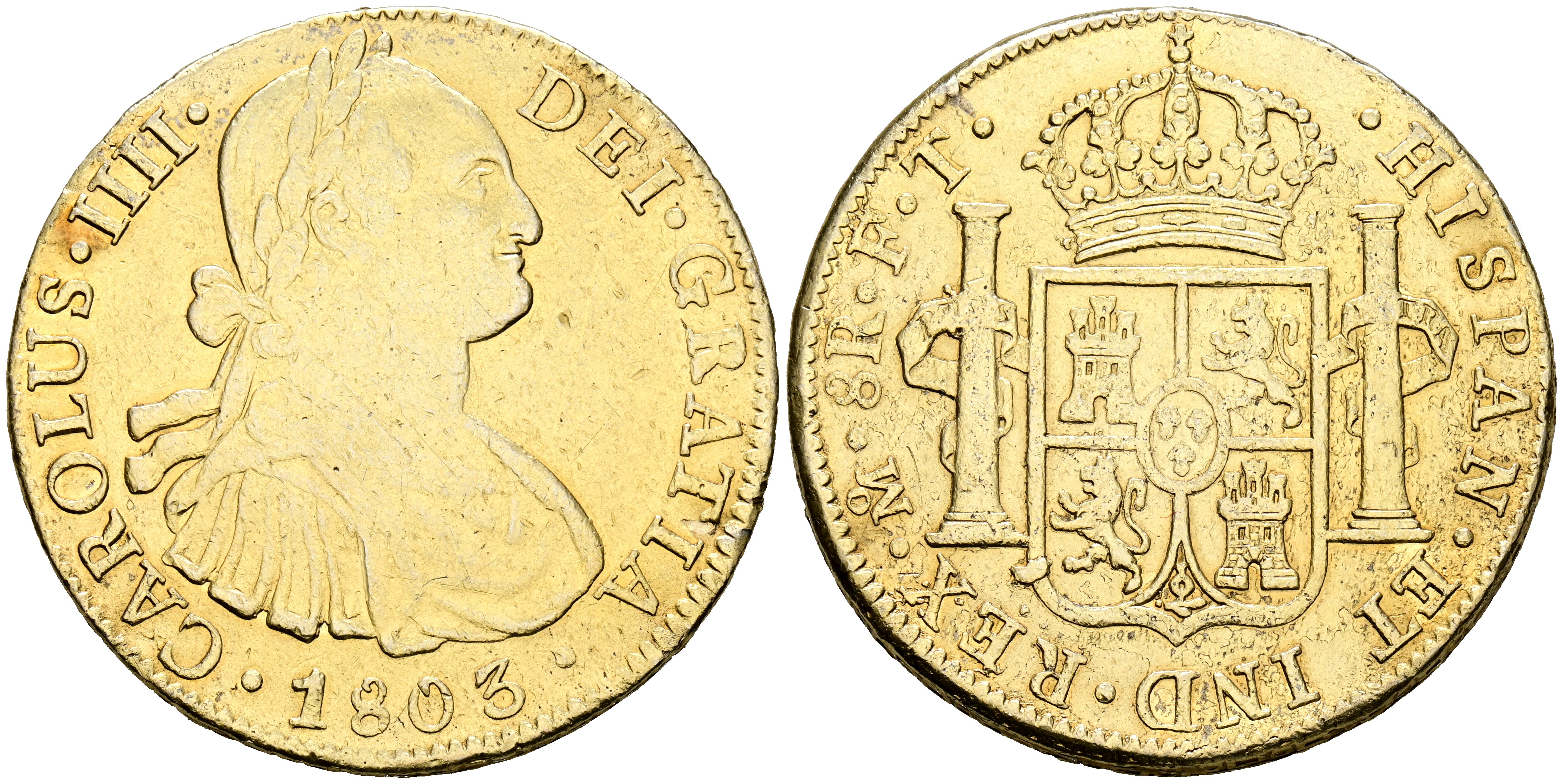 CARLOS IV (1788-1808). 8 Reales. (Ar. 26,72g/40mm). 1803. México FT. (Cal-2019-977). BC. Sobredorado.