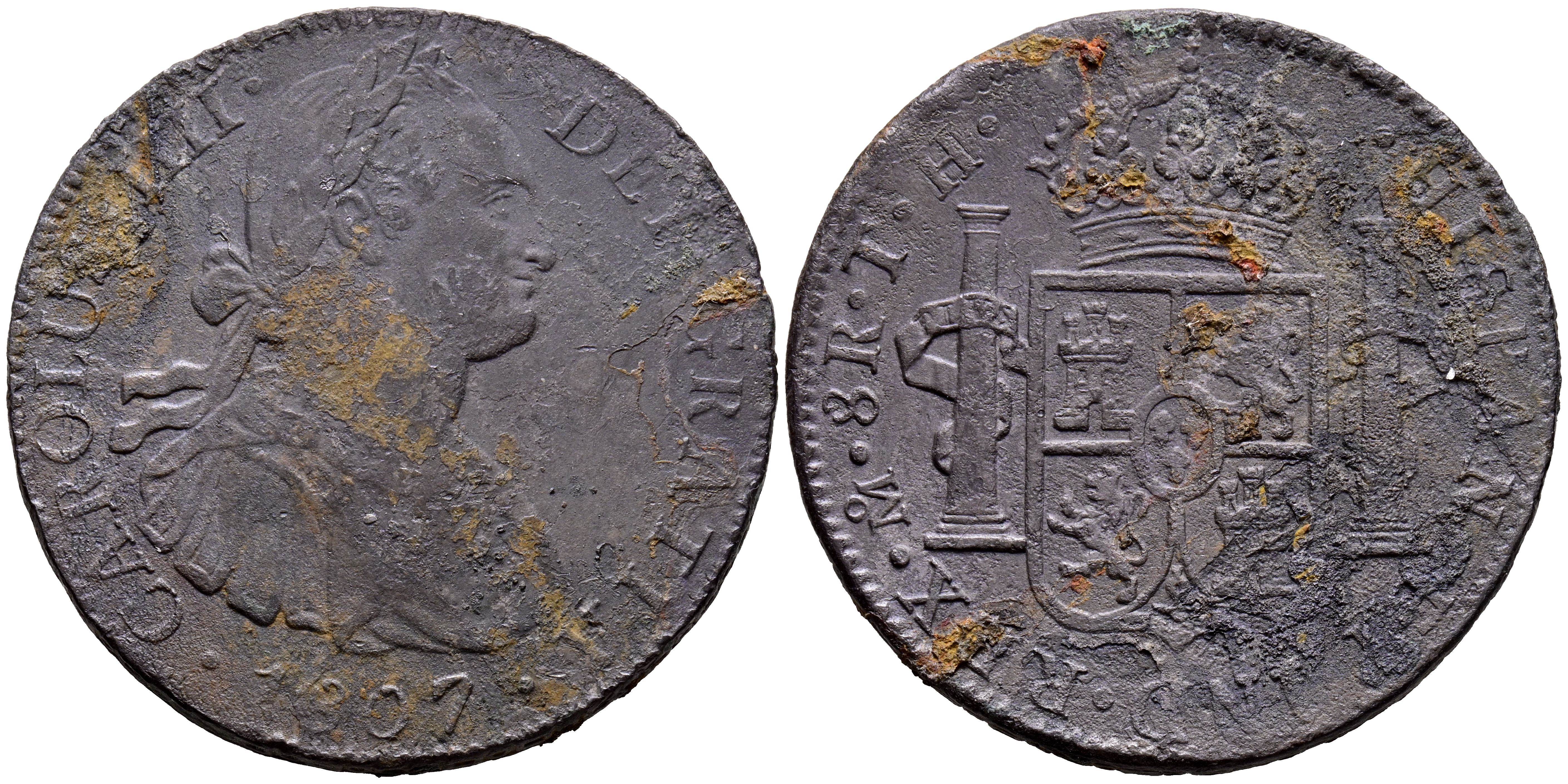 CARLOS IV (1788-1808). 8 Reales. (Ar. 26,14g/39mm). 1807. México TH. (Cal-2019-986). MBC-. Oxidaciones. Pátina negra.