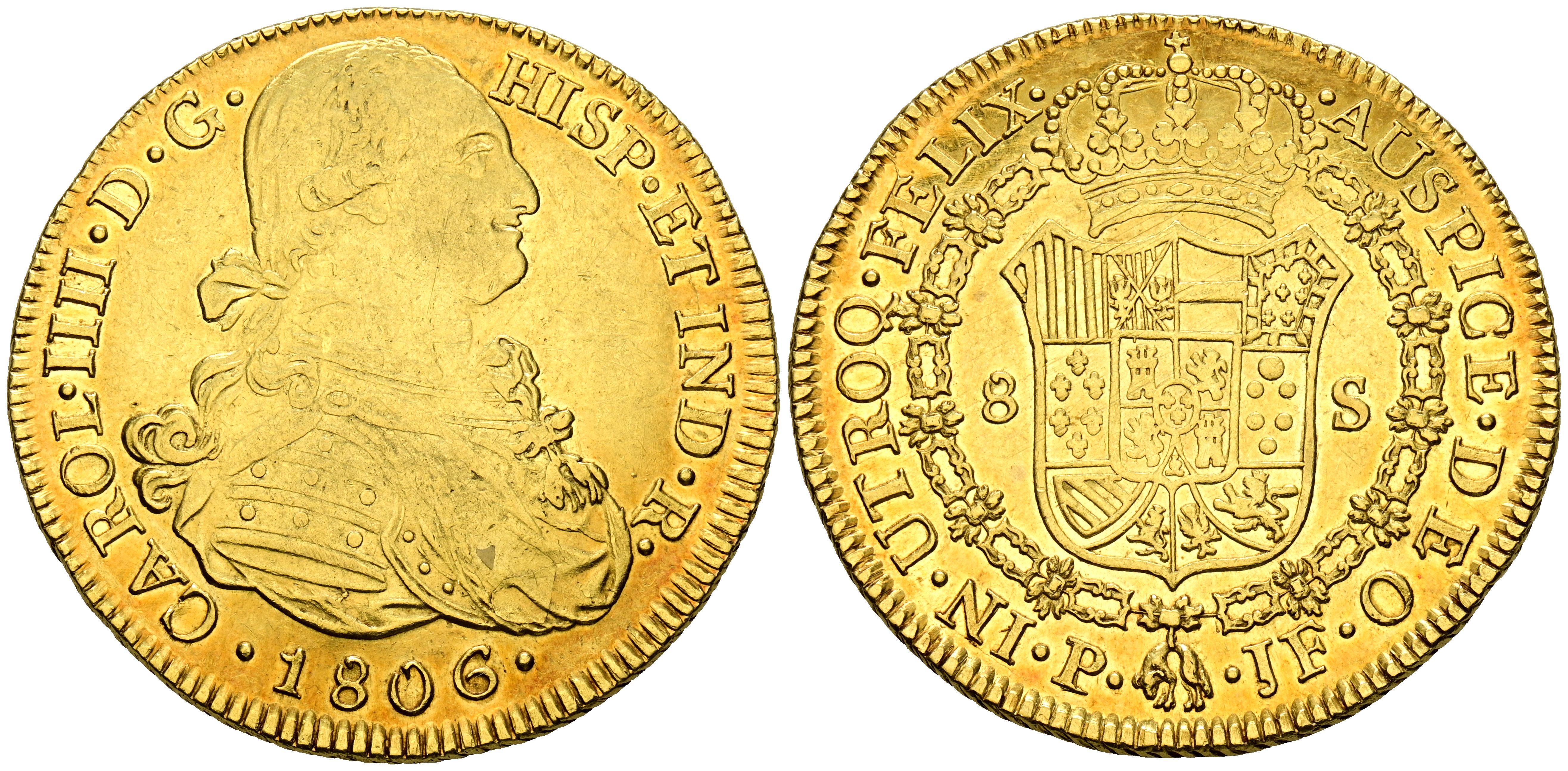CARLOS IV (1788-1808). 8 Escudos. (Au. 27,02g/37mm). 1806. Popayán JF. (Cal-2019-1686). MBC+/EBC-. Restos de brillo original, bonito ejemplar.
