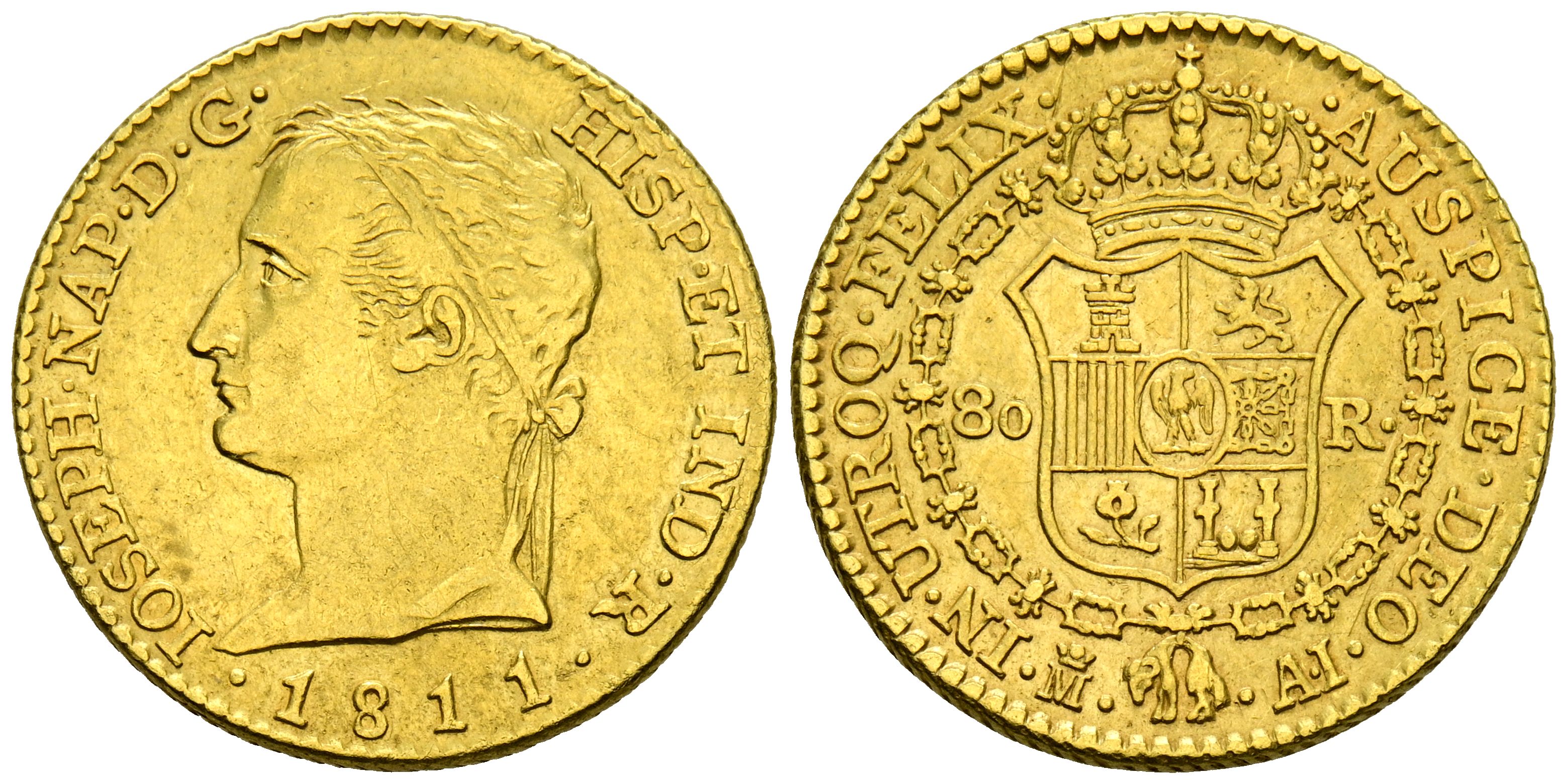 JOSÉ NAPOLEÓN (1808-1813). 80 Reales (Au. 6.76g/22mm). 1811. Madrid AI. Busto diademado. (Cal-2019-49). MBC+. Escasa.