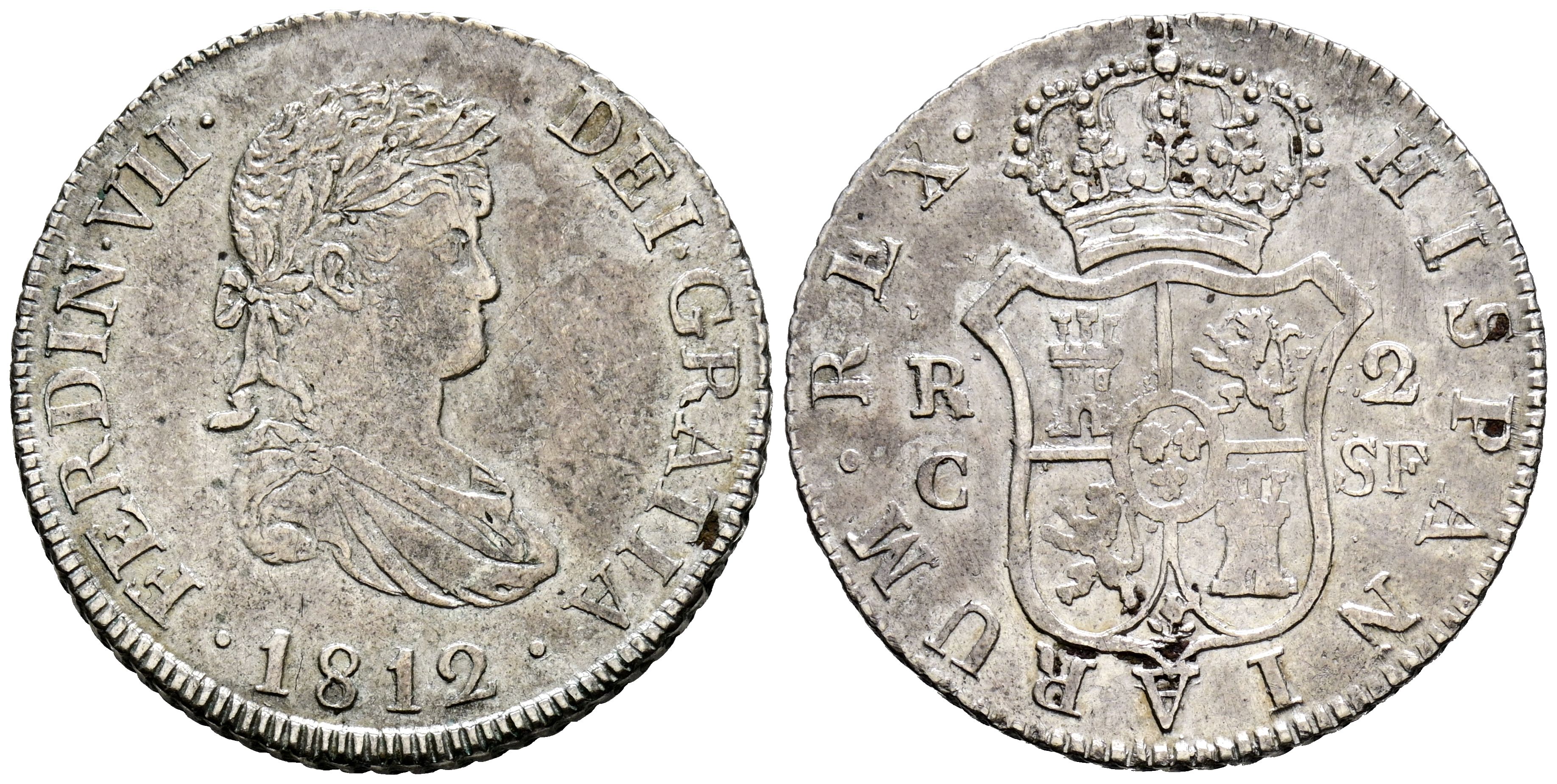 FERNANDO VII (1808-1833). 2 Reales. (Ar. 5,31g/26mm). 1812. Cataluña SF (acuñada en Mallorca). (Cal-2019-765). EBC-. Escasa y más así.