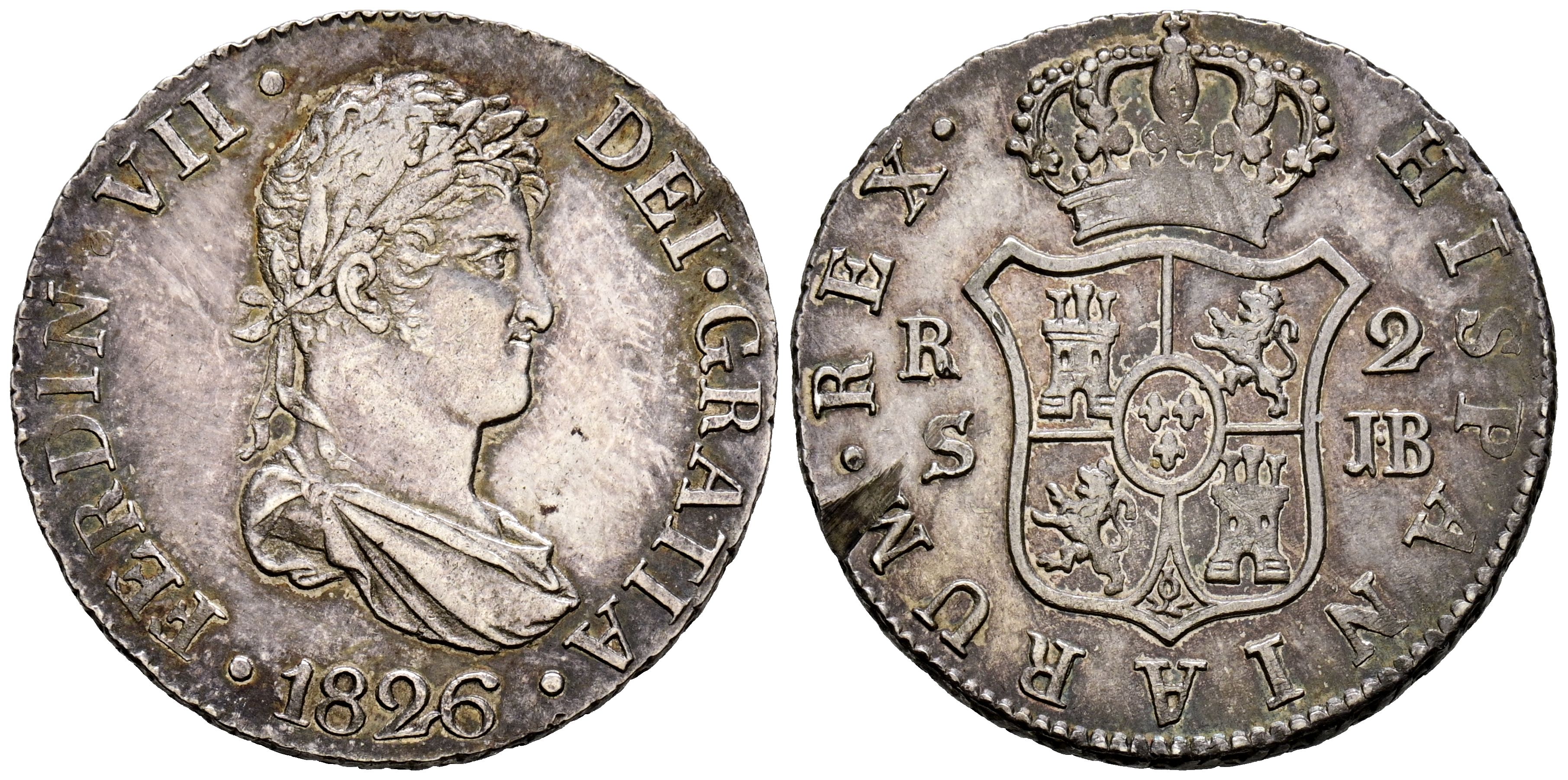 FERNANDO VII (1808-1833). 2 Reales. (Ar. 5,85g/25mm). 1826. Sevilla JB. (Cal-2019-958). MBC+. Limpiada. Hoja en reverso.