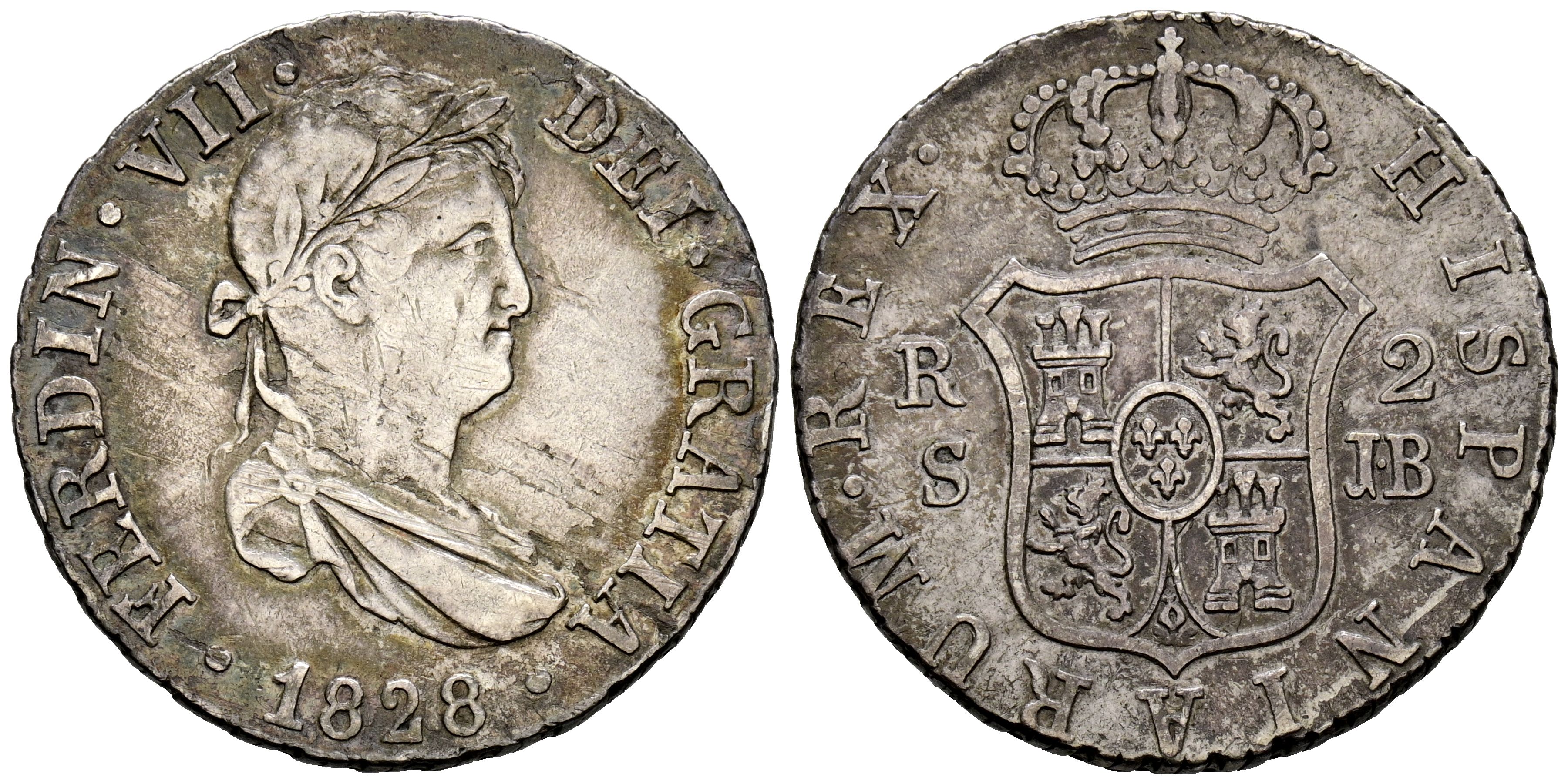 FERNANDO VII (1808-1833). 2 Reales. (Ar. 5,73g/25mm). 1828. Sevilla JB. (Cal-2019-961). BC+/MBC-.