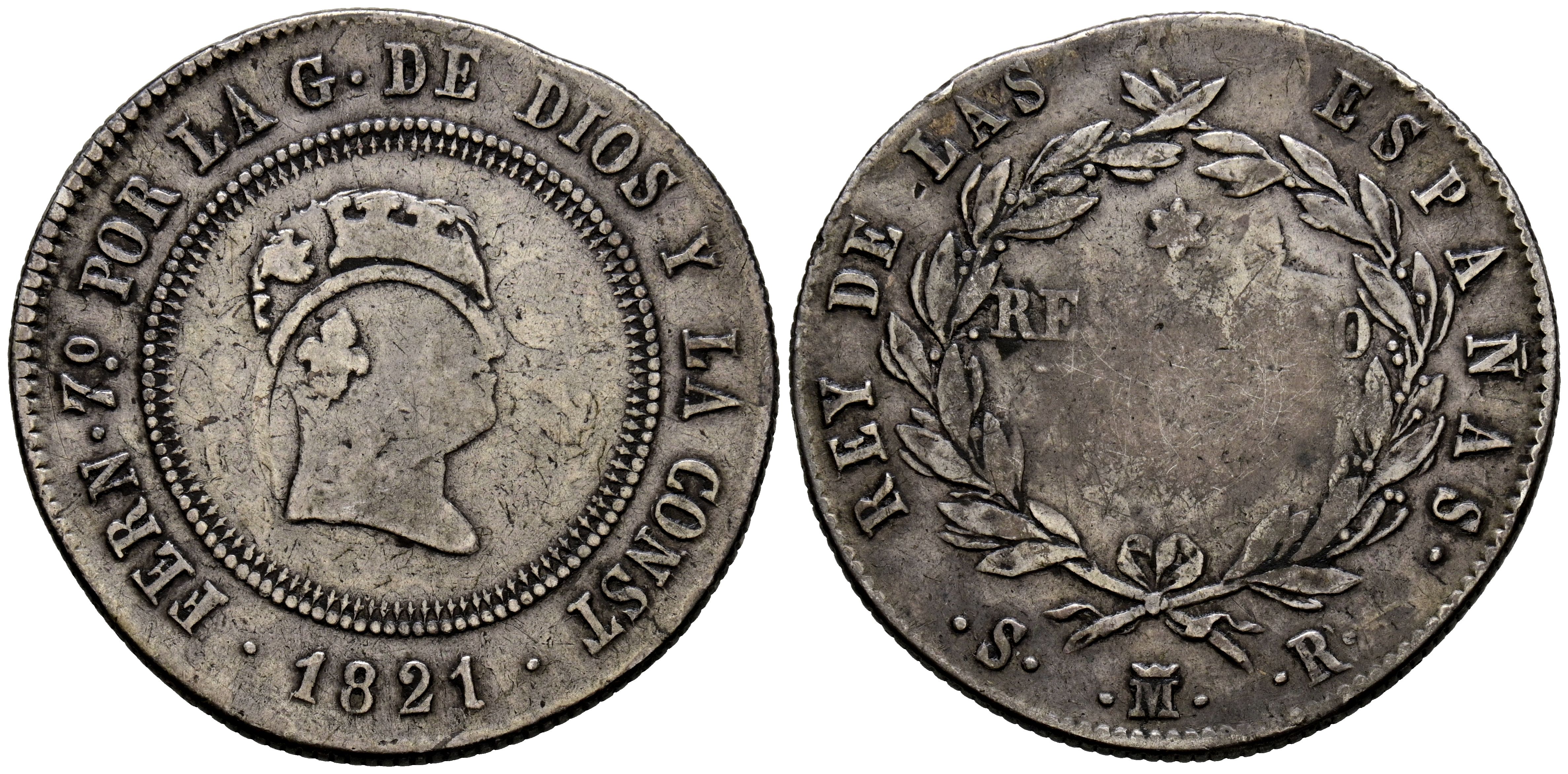 FERNANDO VII (1808-1833). 10 Reales. (Ar. 13,55g28mm). 1821. Madrid SR. (Cal-2019-1088). BC. Restos de la acuñación original visibles.