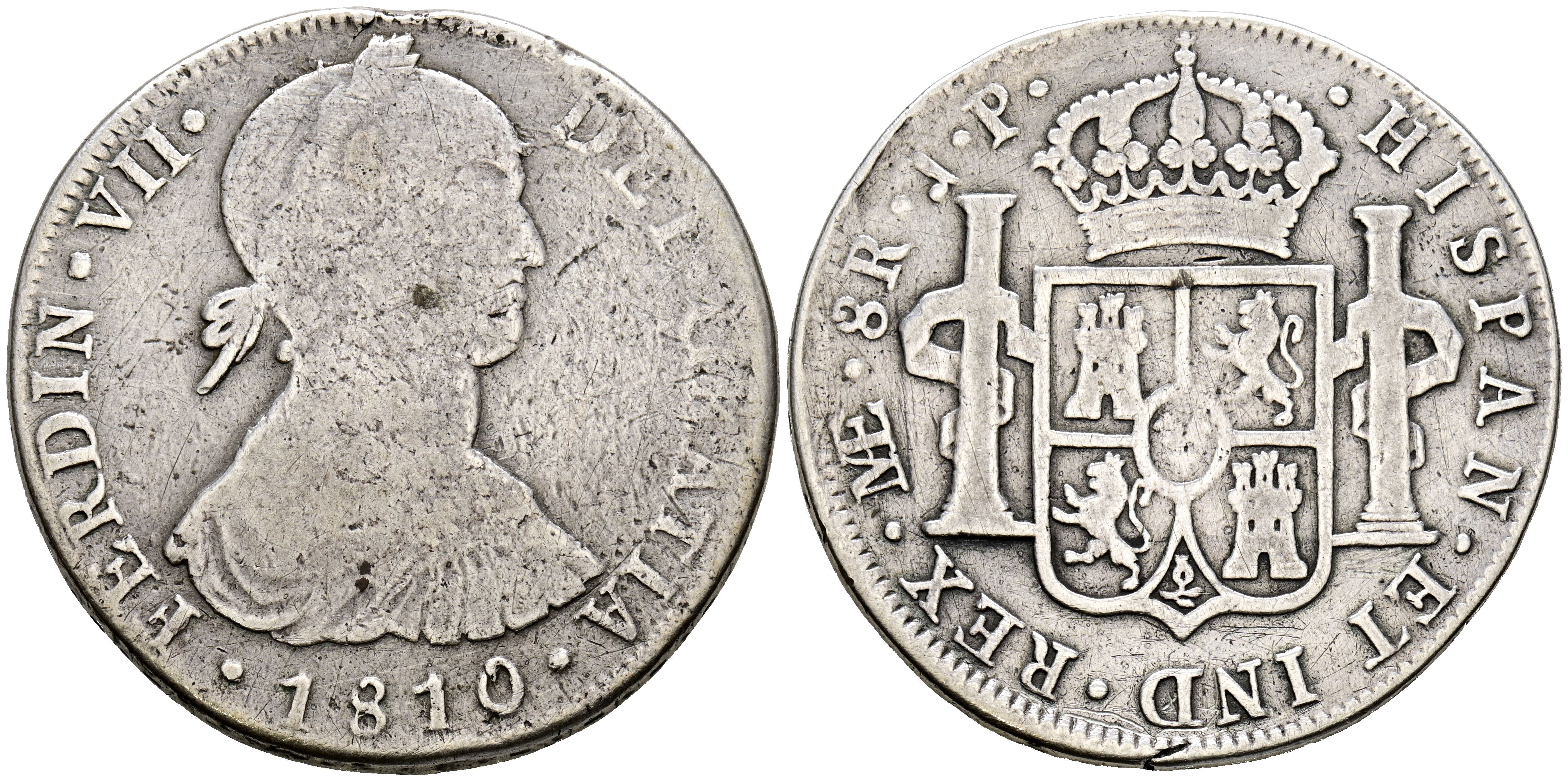 FERNANDO VII (1808-1833). 8 Reales. (Ar. 26,30g /39mm). 1810. Lima JP. Busto indígena. (Cal-2019-1241). BC/BC+. Estuvo colgada.