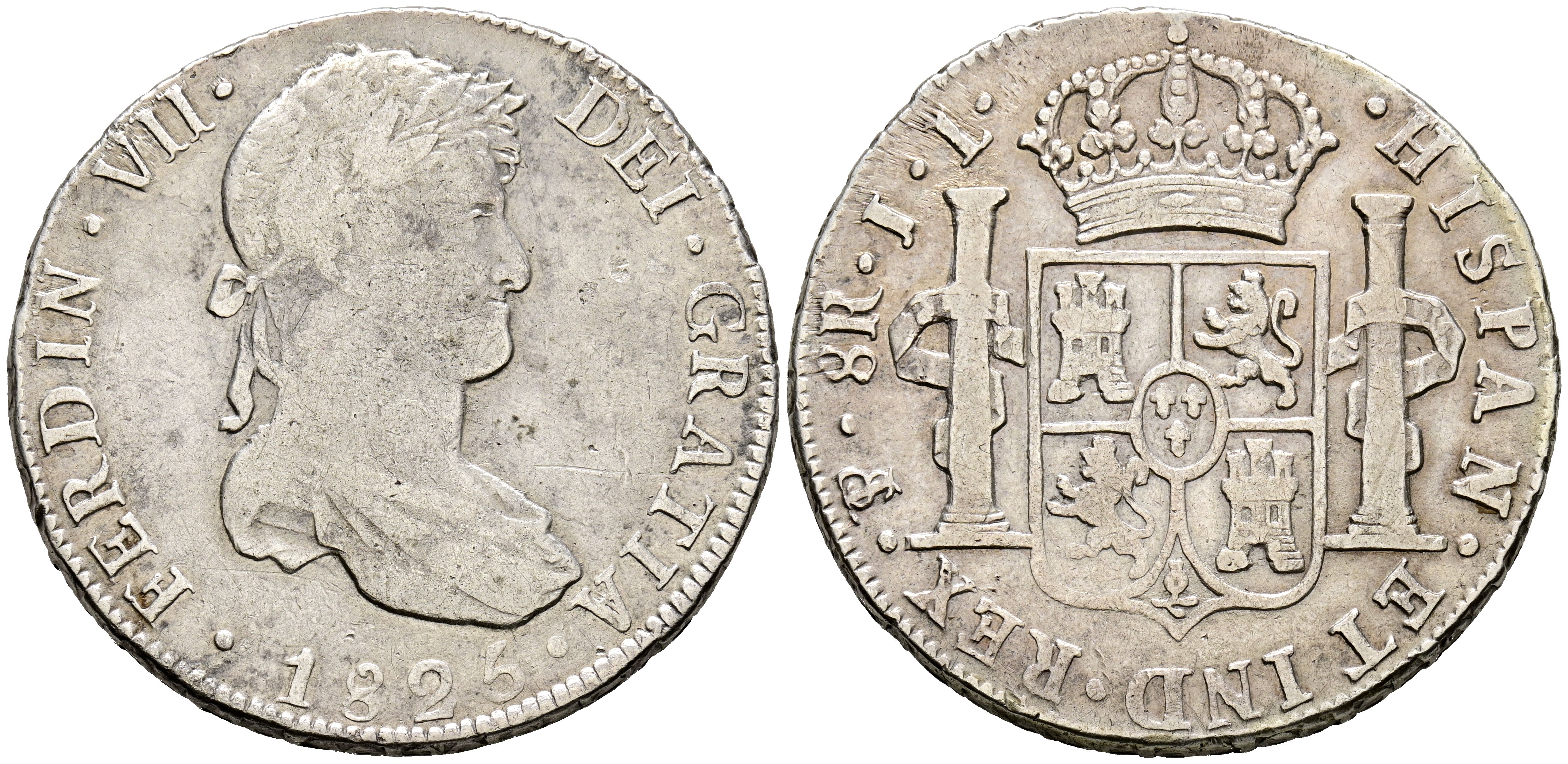 FERNANDO VII (1808-1833). 8 Reales. (Ar. 26,81g/38mm). 1825. Potosi JL. (Cal-2019-1394). Acuñación Republicana. MBC-.