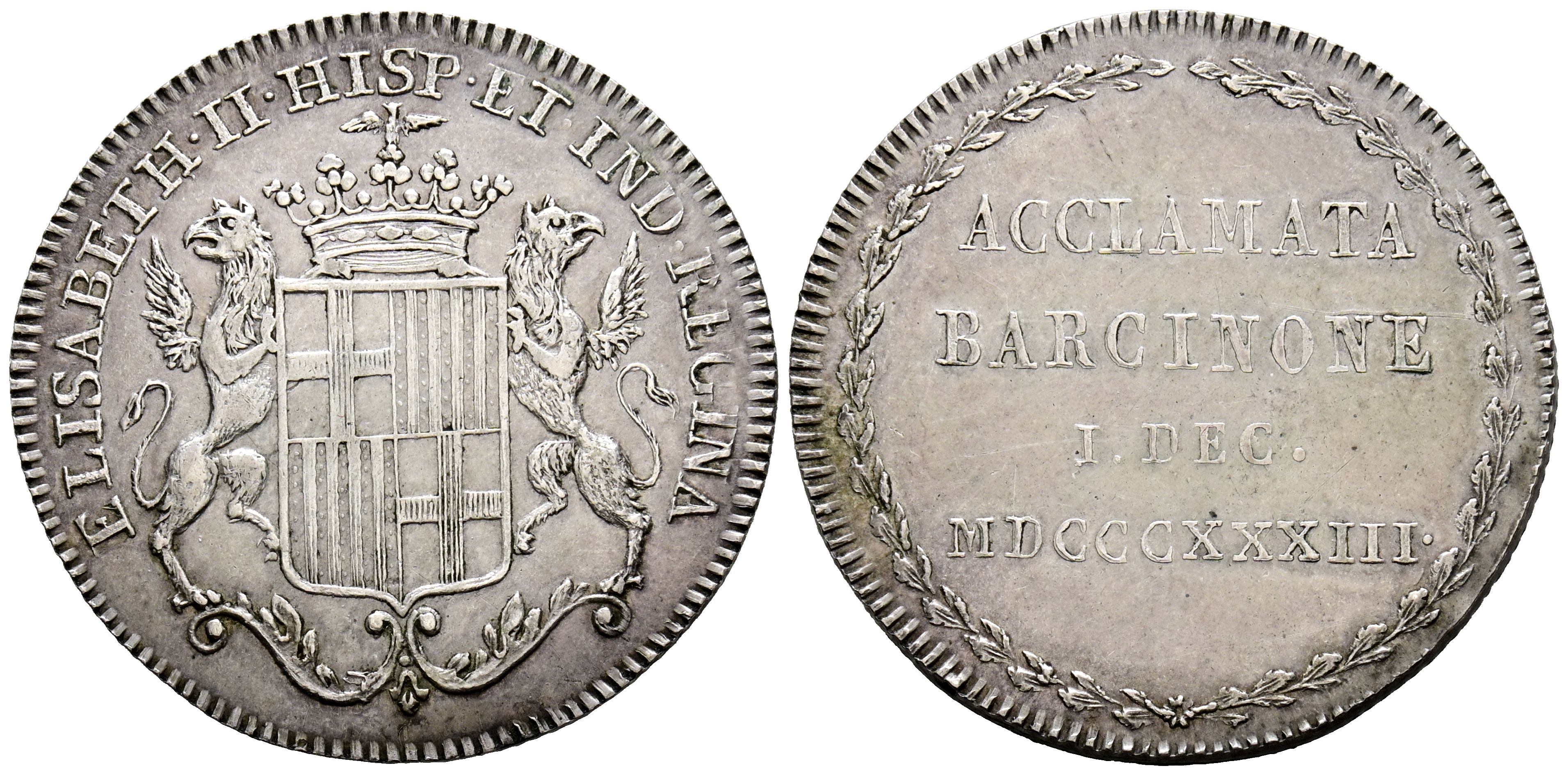 ISABEL II (1833-1868). Proclamación en Barcelona (Ar. 5,98g/27mm). 1833 . Grabador: J. Masferrer. Módulo de 2 Reales. (Ha. 5). EBC-.