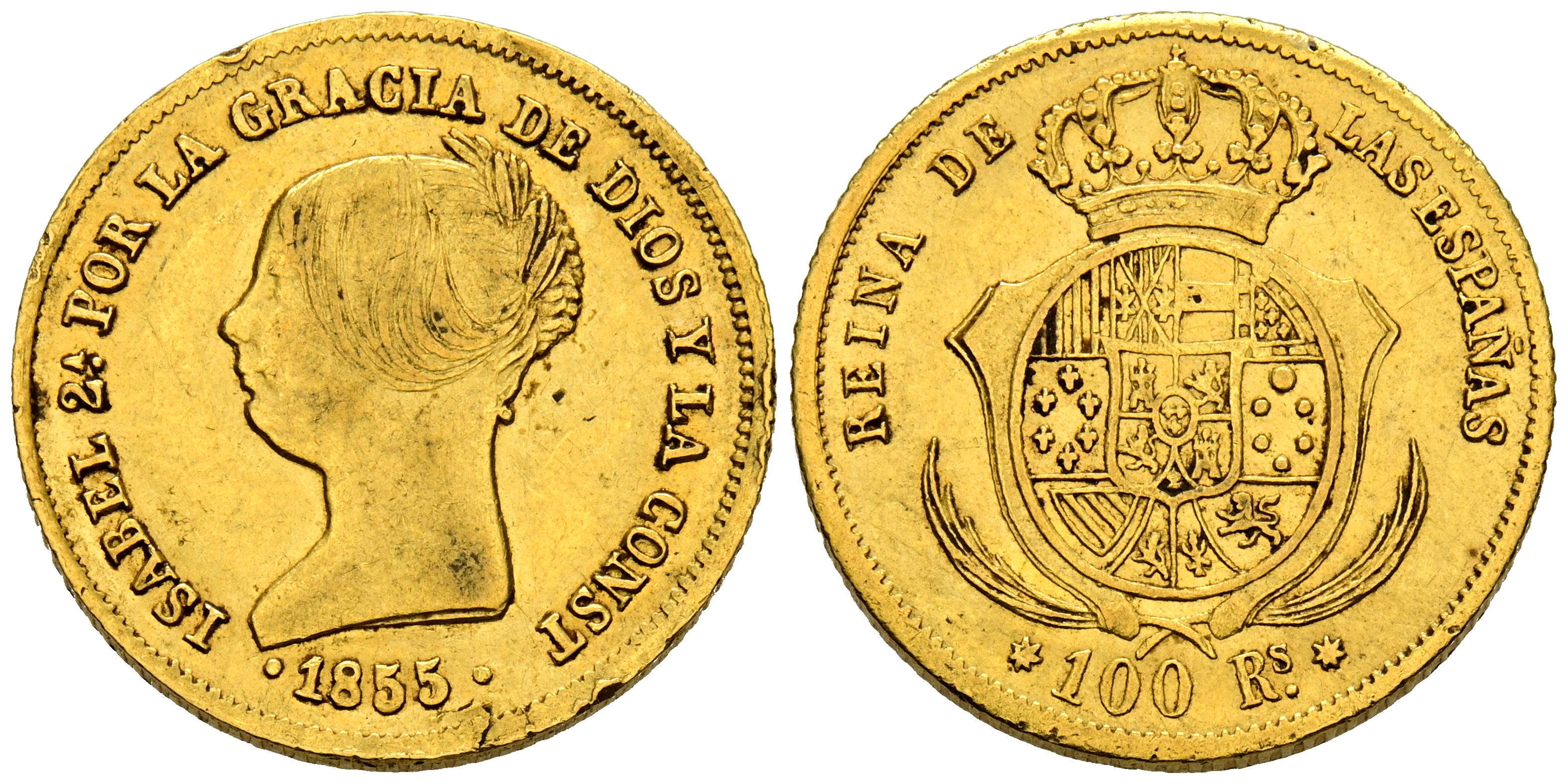ISABEL II (1833-1868). 100 Reales. (Au. 8,36g/22mm). 1855. Sevilla. (Cal-2019-796). MBC+.