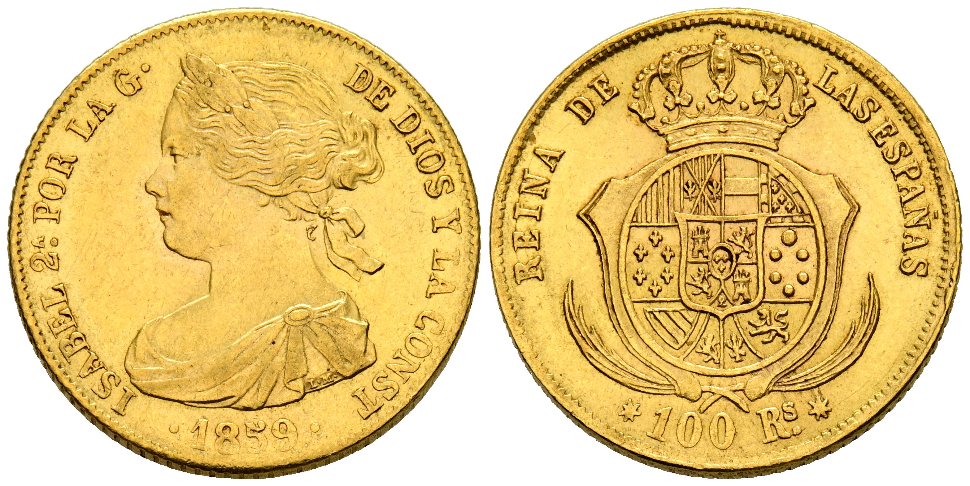 ISABEL II (1833-1868). 100 Reales. (Au. 8,35g/22mm). 1859. Sevilla. (Cal-2019-800). EBC-.
