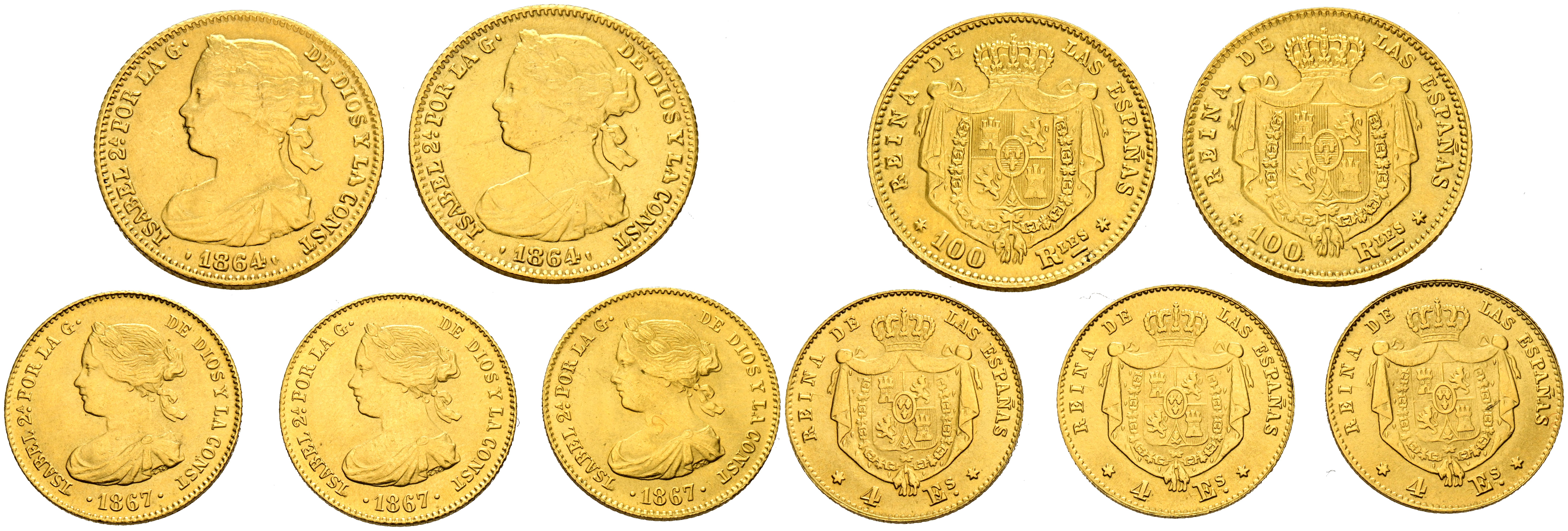 ISABEL II (1833-1868). Conjunto de 5 monedas, tres de ellas de 4 Escudos y dos de ellas de 100 Reales, todas ellas copias de joyería de 0,870 milésimas. Peso total del conjunto: 26,68g. A EXAMINAR.