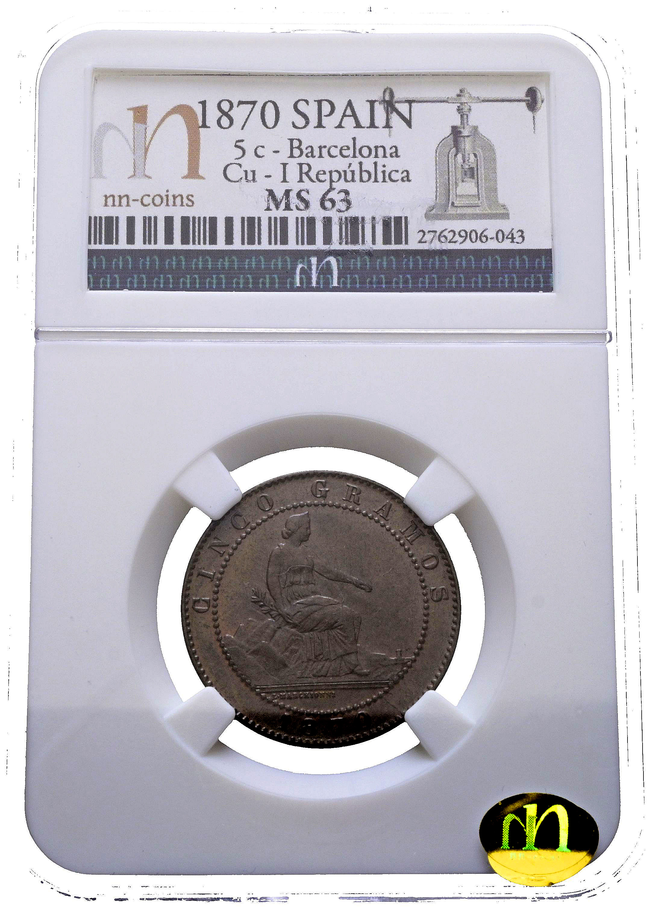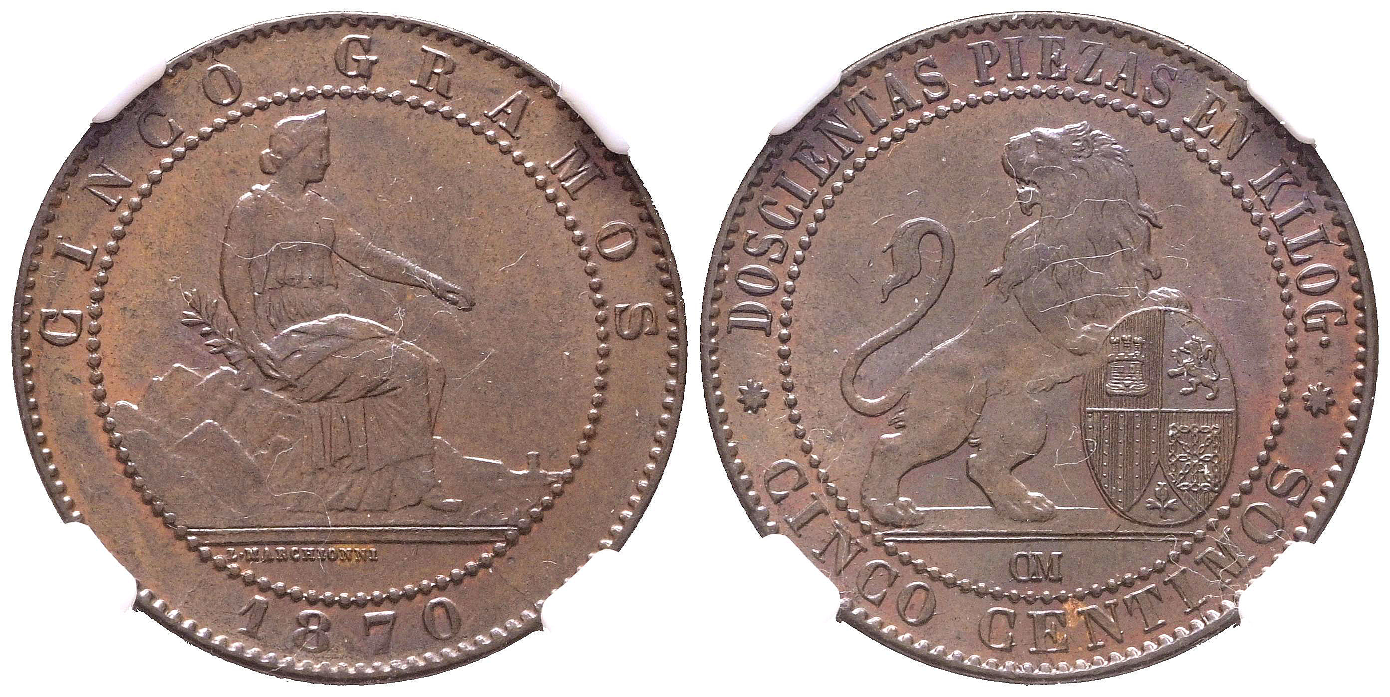 GOBIERNO PROVISIONAL (1868-1871). 5 Céntimos. (Ae. 5,00g/25mm)*. 1870. Barcelona. (Cal-2019-5). Encapsulada por NN Coins MS64. *Peso y medidas teóricos.