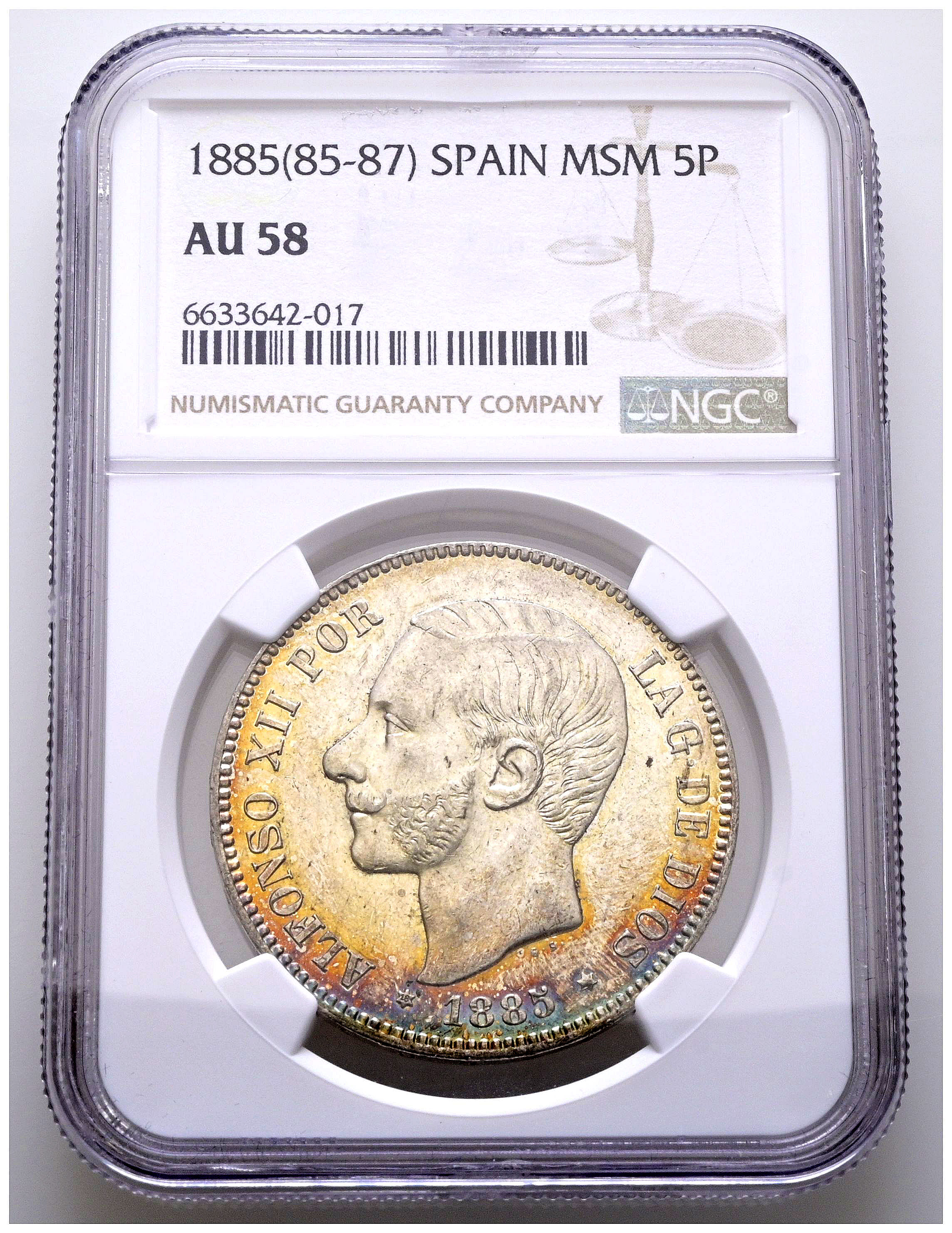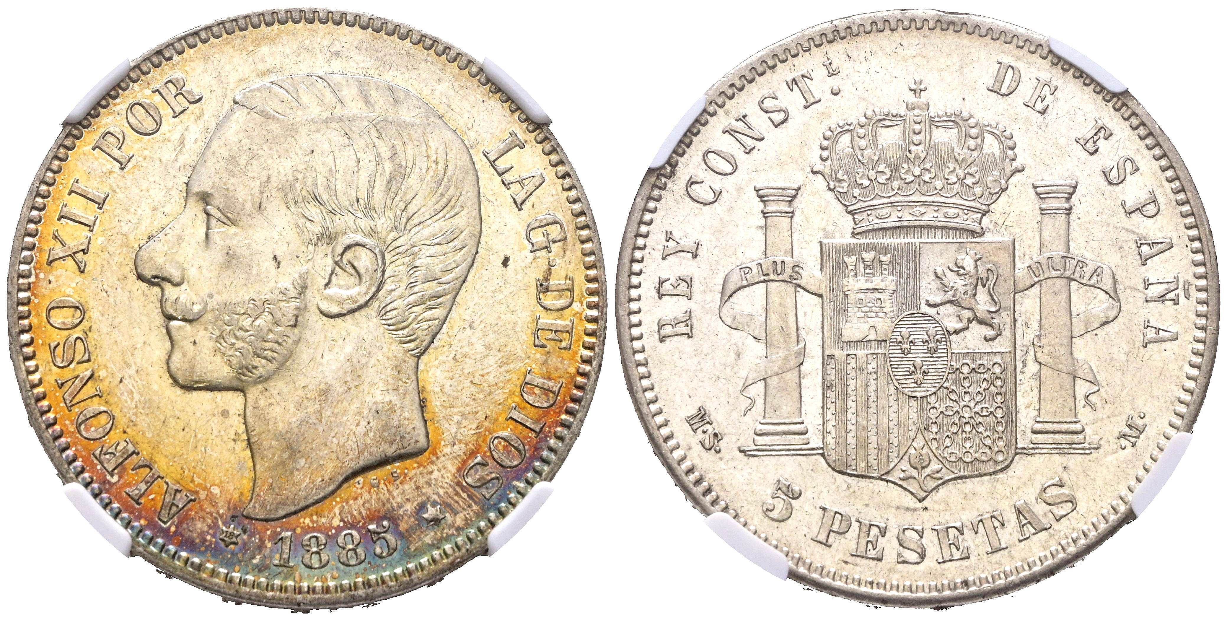 ALFONSO XII (1874-1885). 5 Pesetas. (Ar. 25,00g/37mm)*. 1885 *18-87. Madrid MSM. (Cal-2019-62). Acuñada bajo el reinado de Alfonso XIII. Encapsulada por NGC AU58. *Peso y medida teóricos.