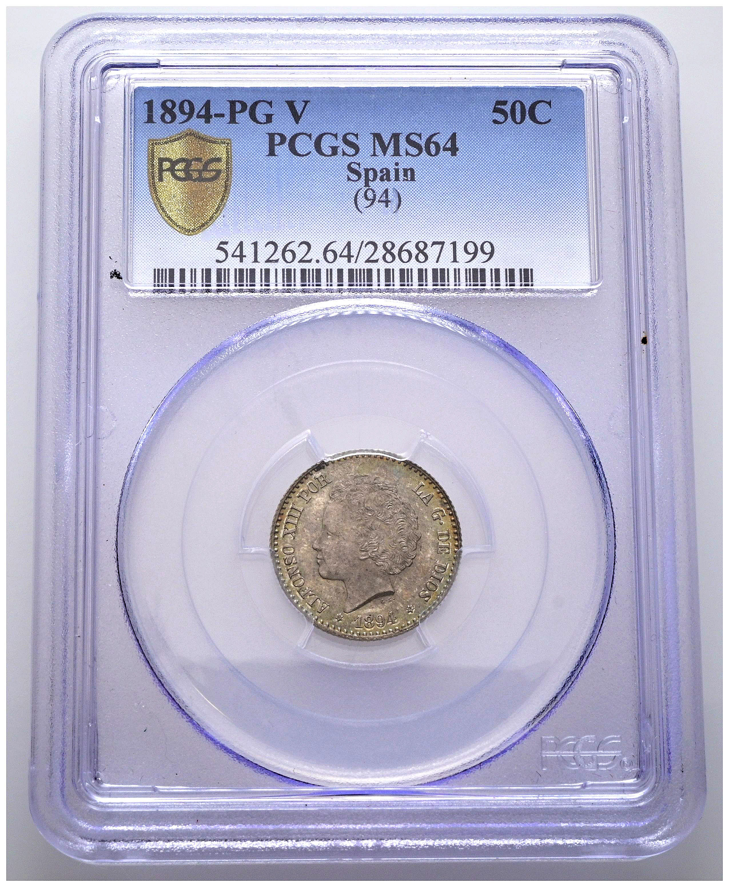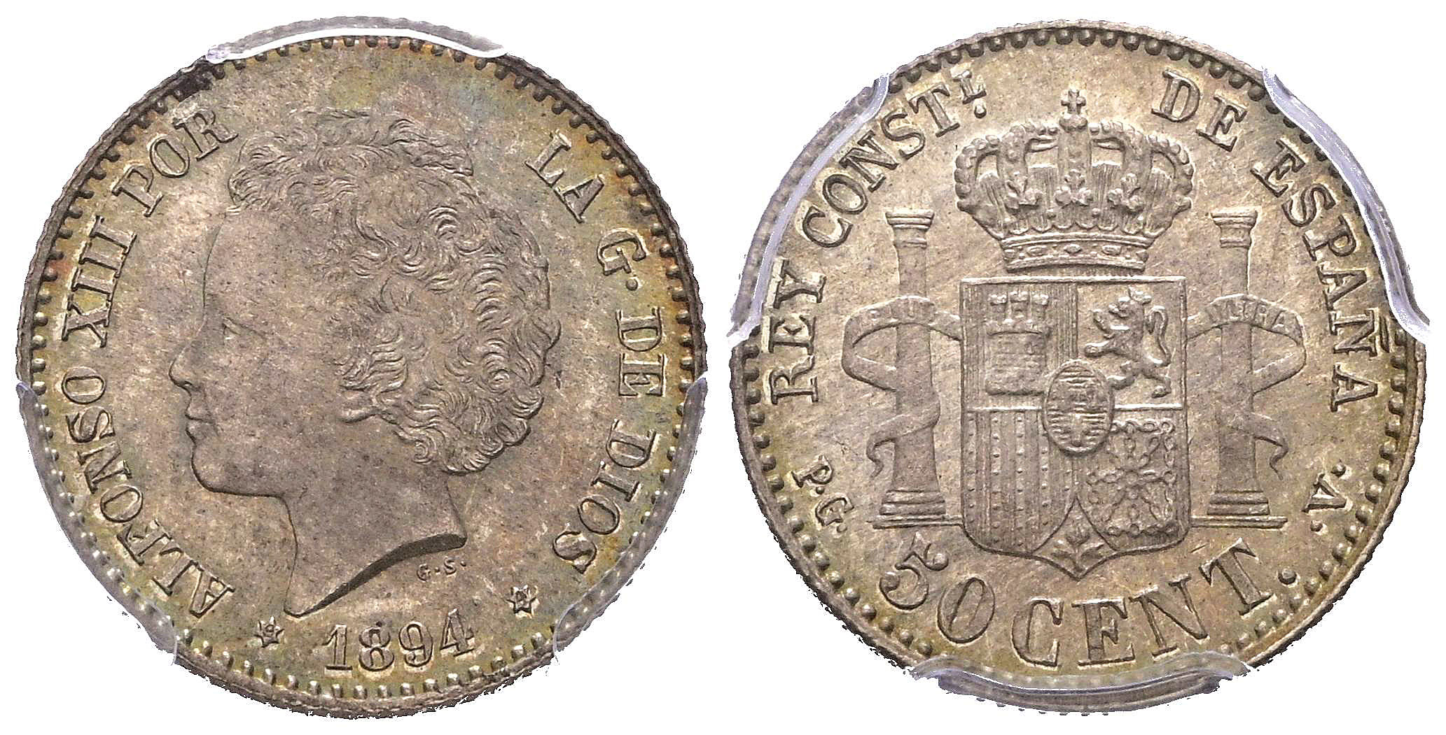 ALFONSO XIII (1885-1931). 50 Céntimos. (Ar. 2,50g/18mm)*. 1894 *9-4. Madrid PGV. (Cal-2019-43). Encapsulado por PCGS MS64. *Peso y medidas teóricos.