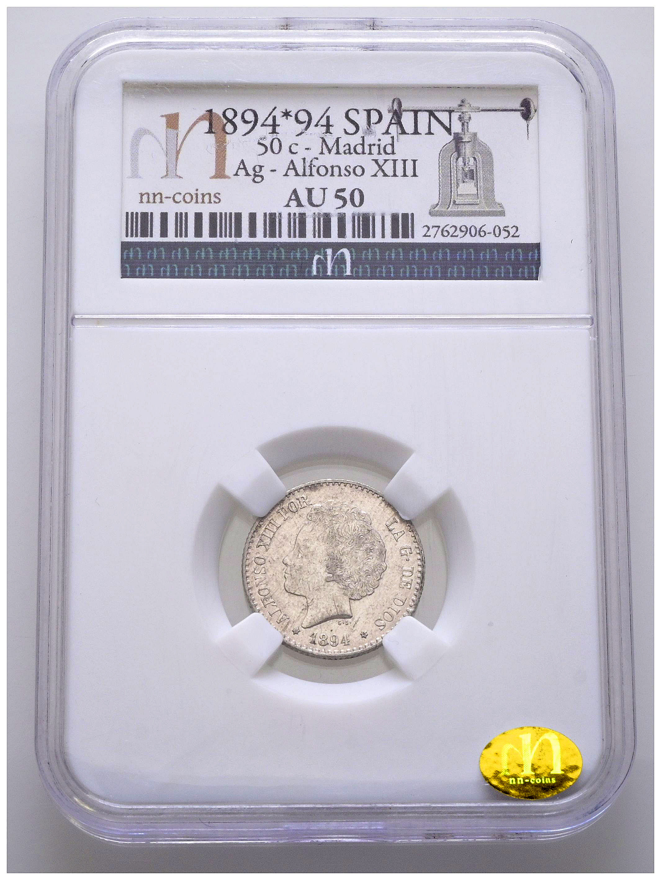 ALFONSO XIII (1885-1931). 50 Céntimos. (Ar. 2,50g/18mm)*. 1894 *9-4. Madrid PGV. (Cal-2019-43). Encapsulada por NN Coins AU50. * Peso y medidas teóricos.