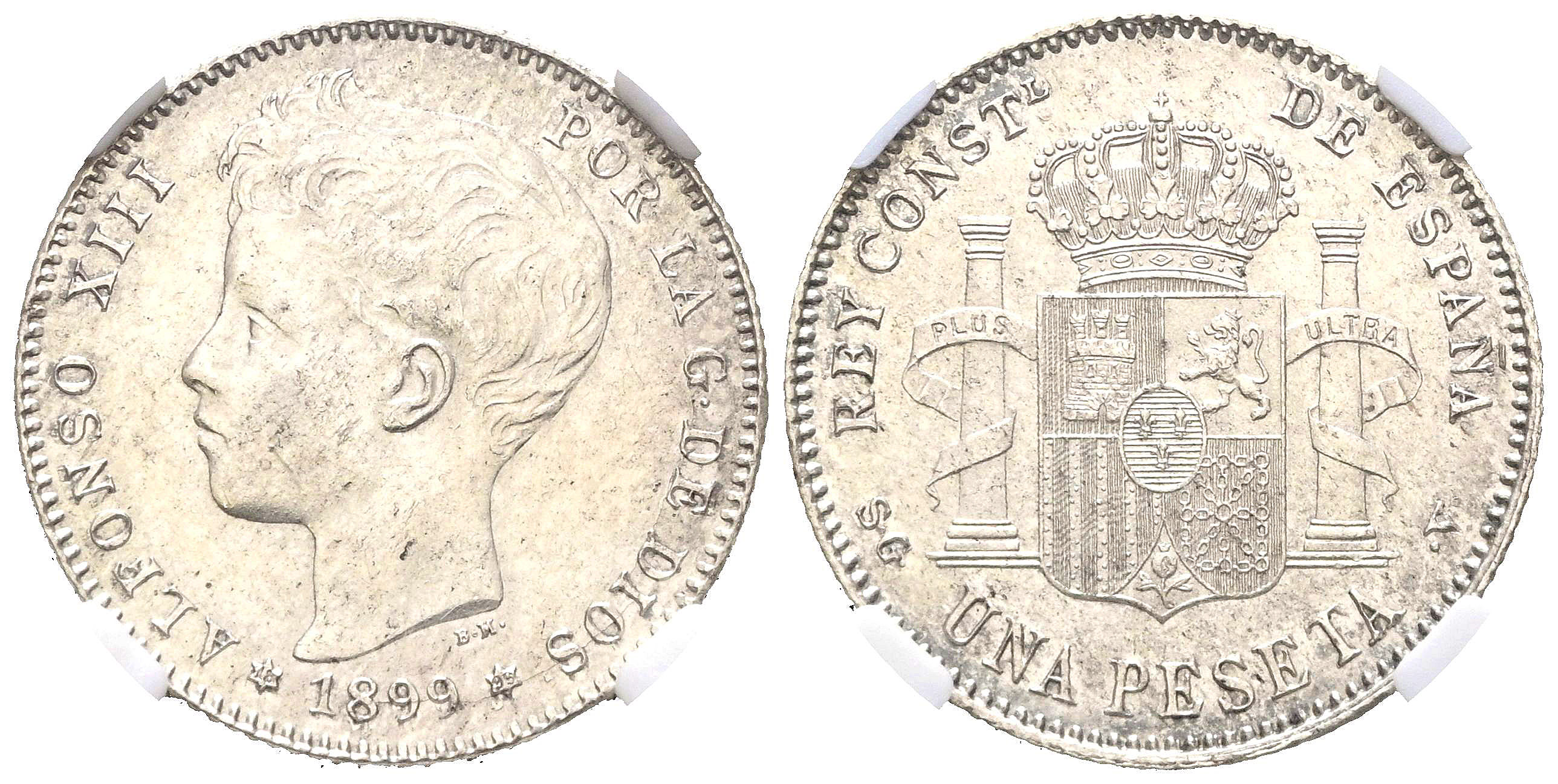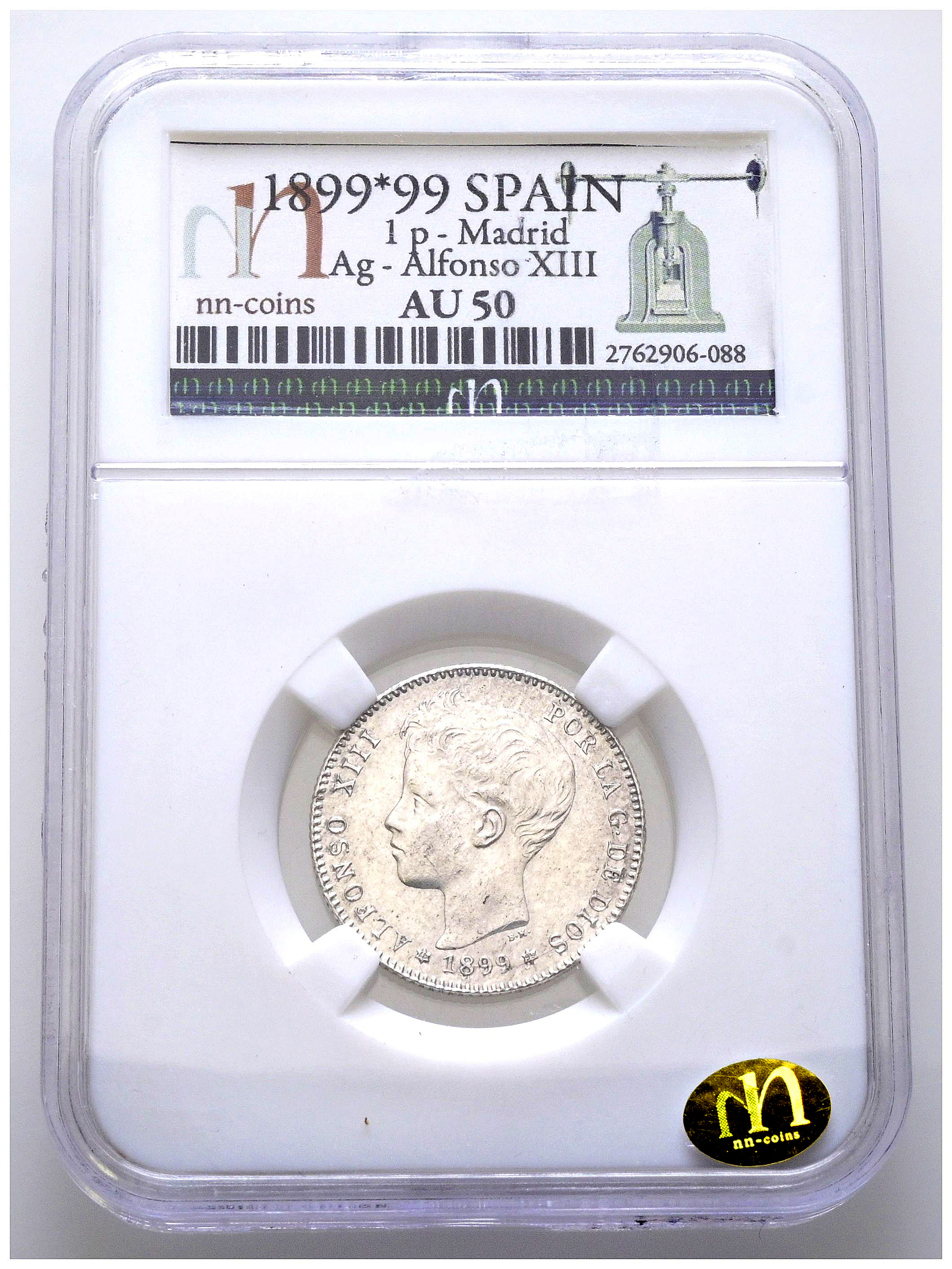 ALFONSO XIII (1885-1931). 1 Peseta. (Ar. 5,00g/23mm)*. 1899 *18-99. Madrid SGV. (Cal-2019-57). Encapsulada por NN Coins AU50. * Peso y medidas teóricos.