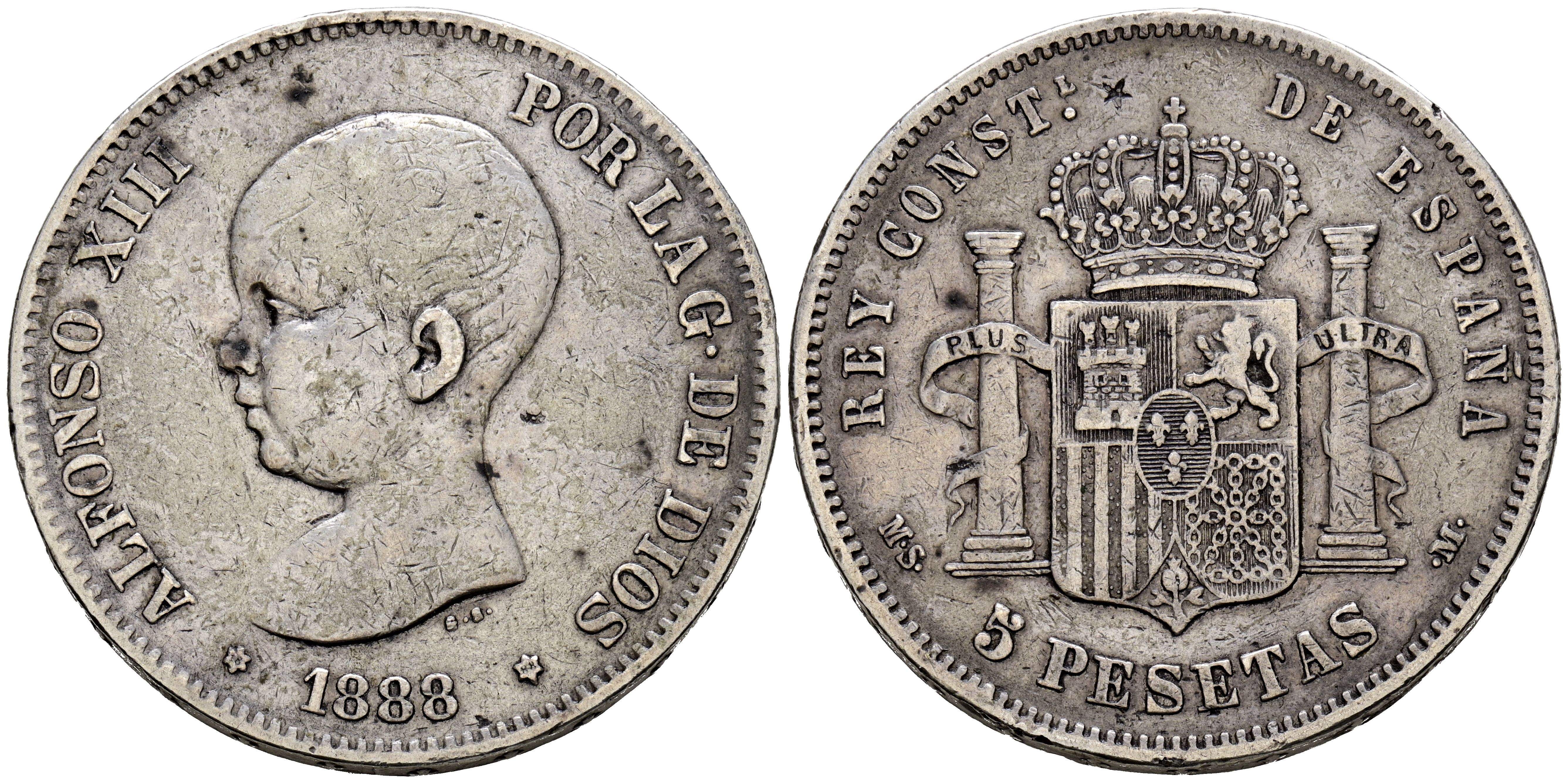 ALFONSO XIII (1885-1931). 5 Pesetas (Ar. 24,75g/37mm). 1888. Madrid MSM. (Cal-2019-89). MBC-. Rara.