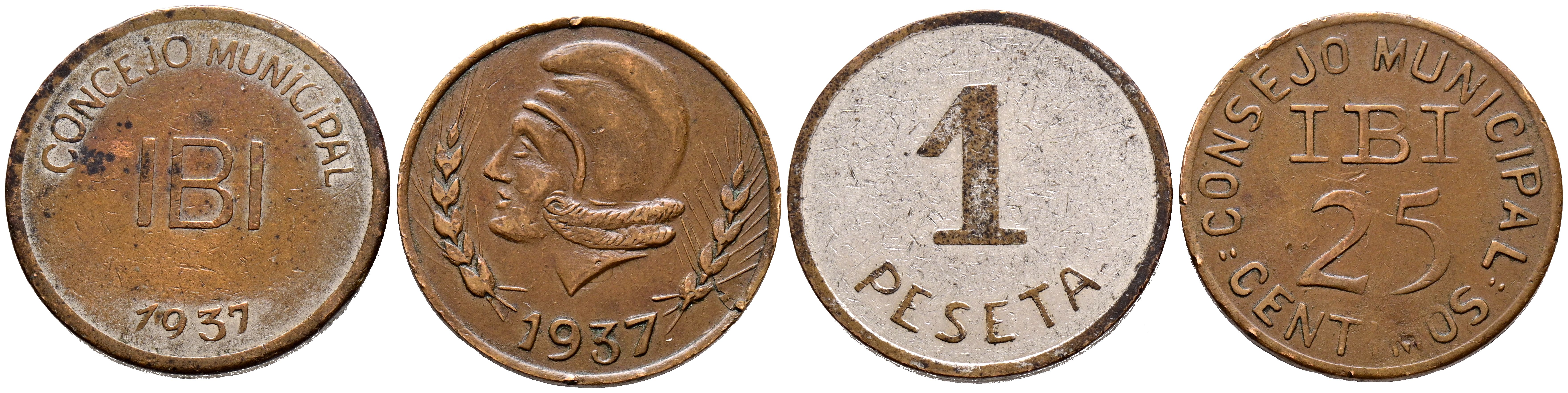 IBI (Alicante). Pareja de 25 Céntimos y 1 Peseta. 1937. (Cal-2019-16/19). Diferentes estados de coservación. A EXAMINAR.