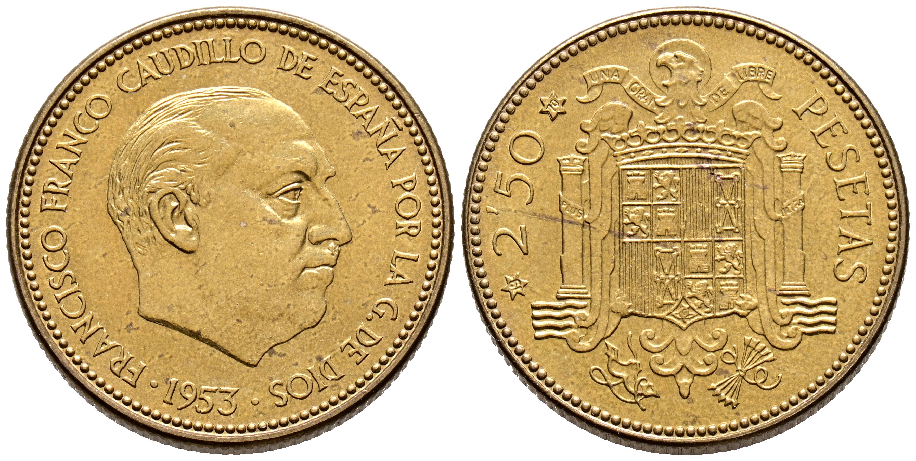 ESTADO ESPAÑOL (1936-1975). 2.50 pesetas. (Al-Ae. 6,76g/25mm). 1953 *19-70. Madrid. (Cal-2019-89). SC-. Escasa.