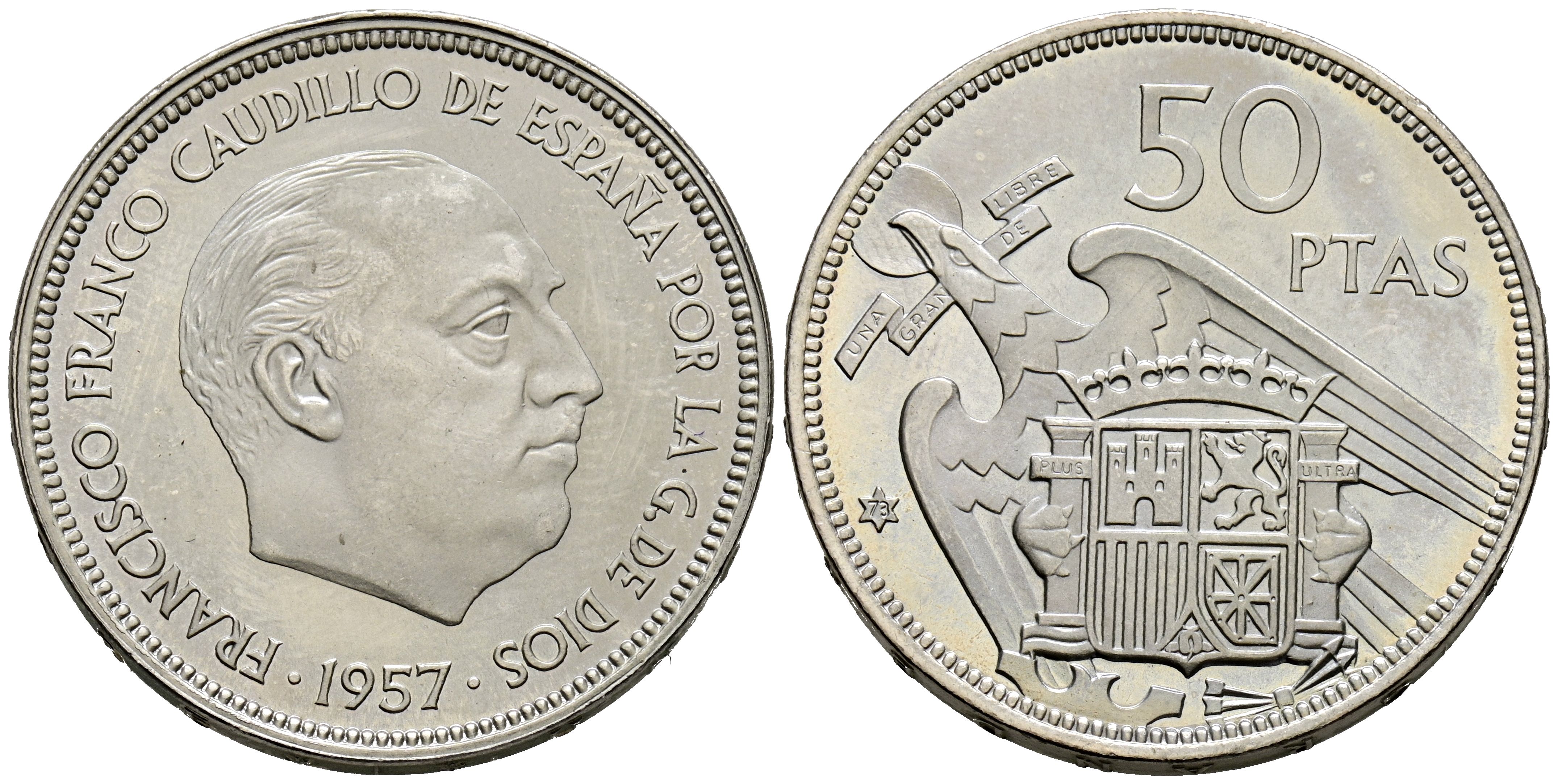ESTADO ESPAÑOL (1936-1975). 50 pesetas. (NI. 12,32g/30mm). 1957 *73. Madrid. (Cal-2019-142). SC. Excelente ejemplar.