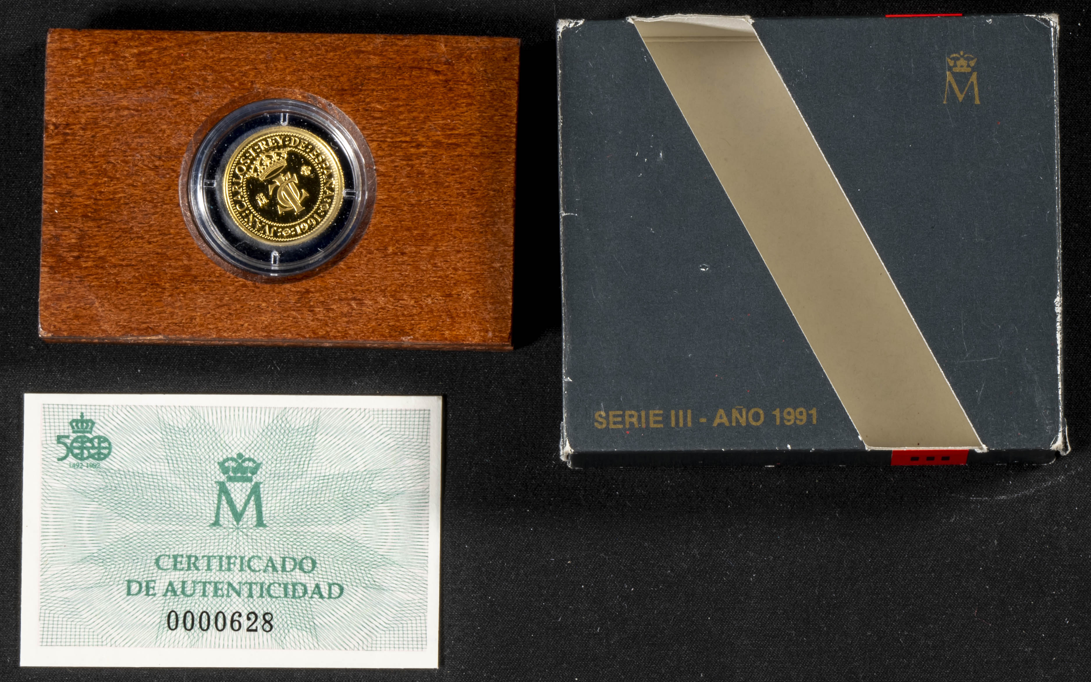 JUAN CARLOS I (1975-2014). 10.000 Pesetas. (Au. 3,37g/19mm). Serie III. Quinto Centenario. 1991. FNMT. PROOF. Presentada en estuche oficial y con certificado de autenticidad.