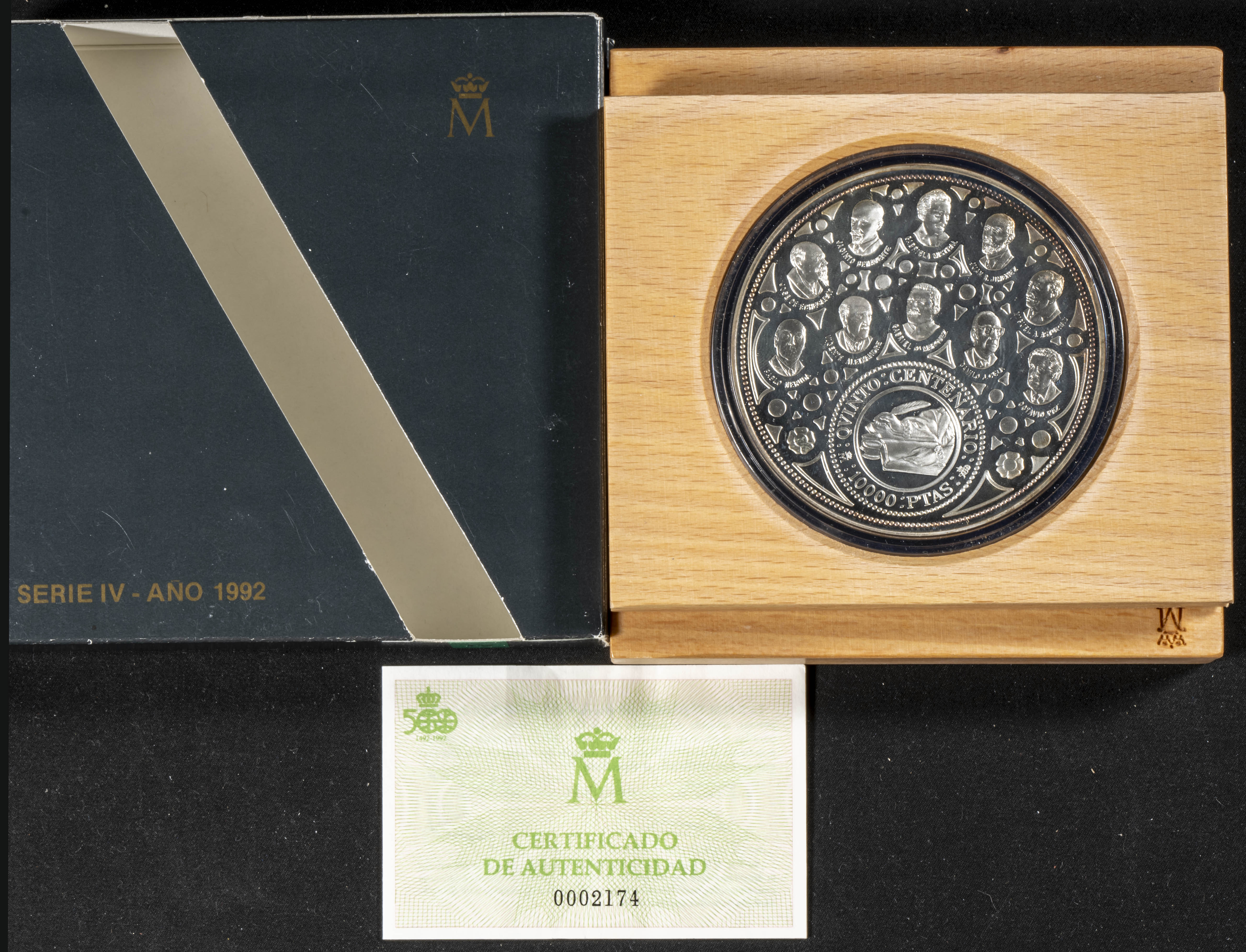JUAN CARLOS I (1975-2014). 10.000 Pesetas. (Ar. 168,75g /73mm). V Centenario. Premios Nobel. 1992. Serie IV. FNMT. FDC. Presentado en estuche oficial y con certificado de autenticidad.
