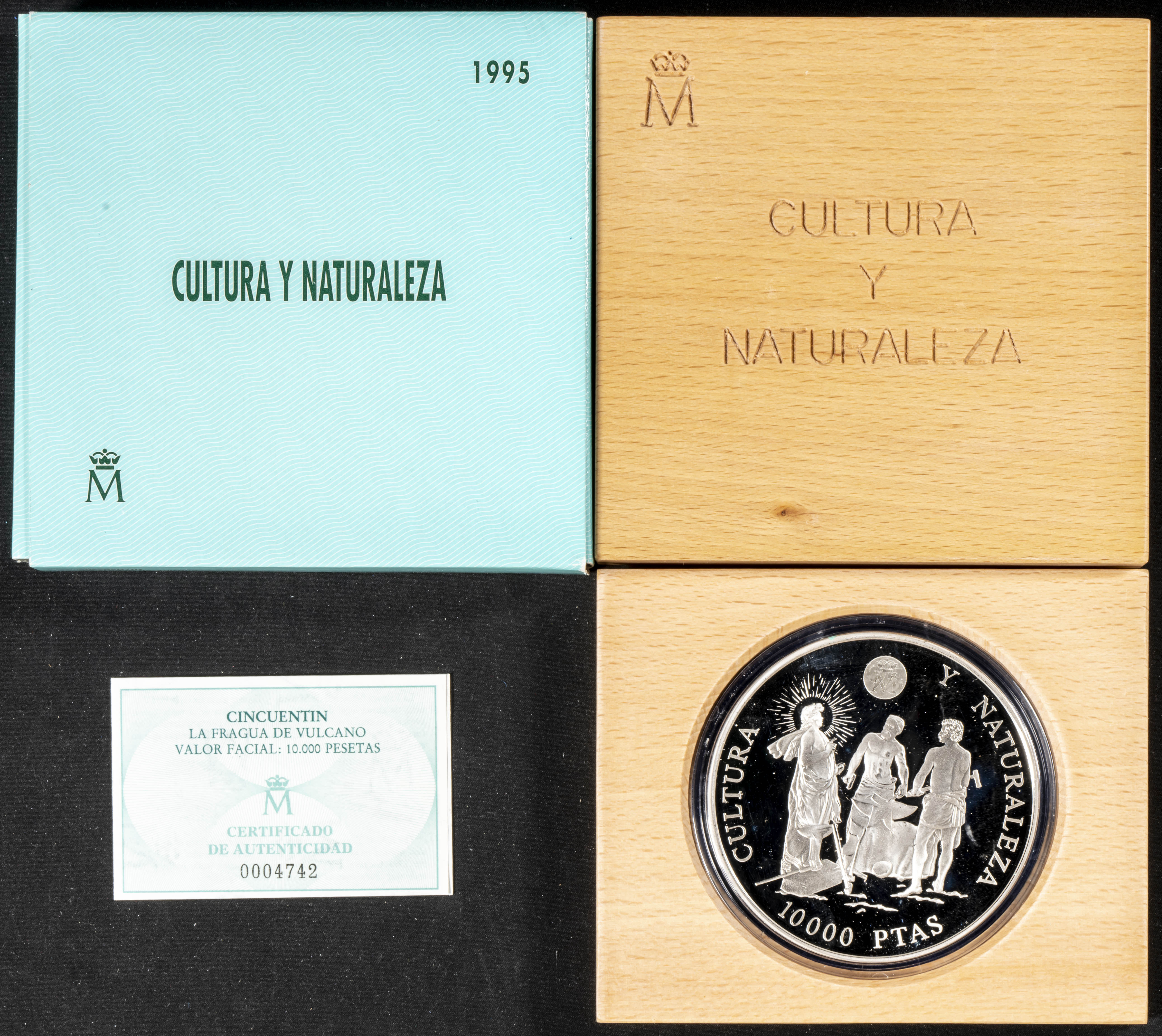 JUAN CARLOS I (1975-2014). 10.000 Pesetas (Ar. 168,75g/73mm). Serie Cultura y Naturaleza: La Fragua de Vulcano. 1995. FNMT. PROOF. Incluye estuche original y certificado de autenticidad. Tirada de 25.000 unidades.